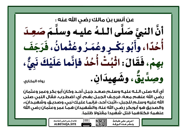 (أن النبي صلى الله عليه وسلم صعد أحدا، وأبو بكر، وعمر، وعثمان فرجف بهم، فقال: اثبت أحد فإنما عليك نبي، وصديق، وشهيدان). رواه البخاري