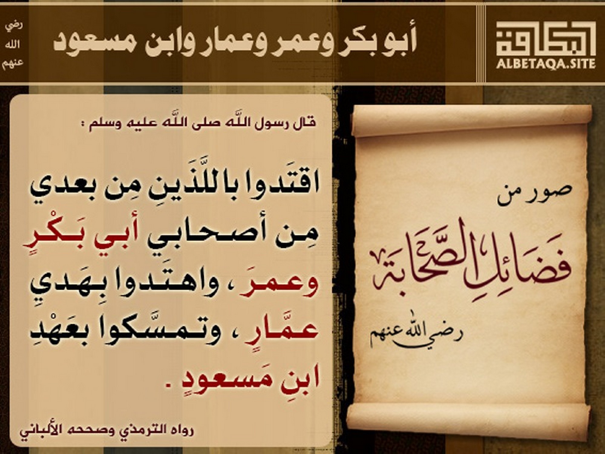 (اقتدوا باللذين من بعدي من أصحابي أبي بكر وعمر، واهتدوا بهدي عمار، وتمسكوا بعهد ابن مسعود). رواه الترمذي وصححه الألباني