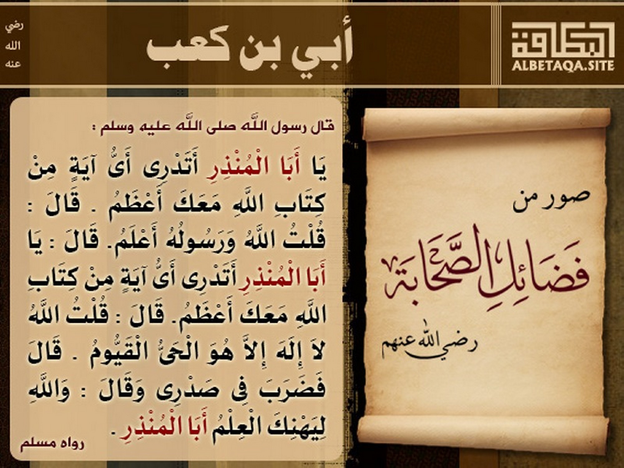 (يا أبا المنذر أتدرى أى آية من كتاب الله معك أعظم. قال: قلت الله ورسوله أعلم. قال: يا أبا المنذر أتدرى أى آية من كتاب الله معك أعظم. قال: قلت الله لا إله إلا هو الحى القيوم. قال فضرب فى صدري وقال: والله ليهنك العلم أبا المنذر). رواه مسلم