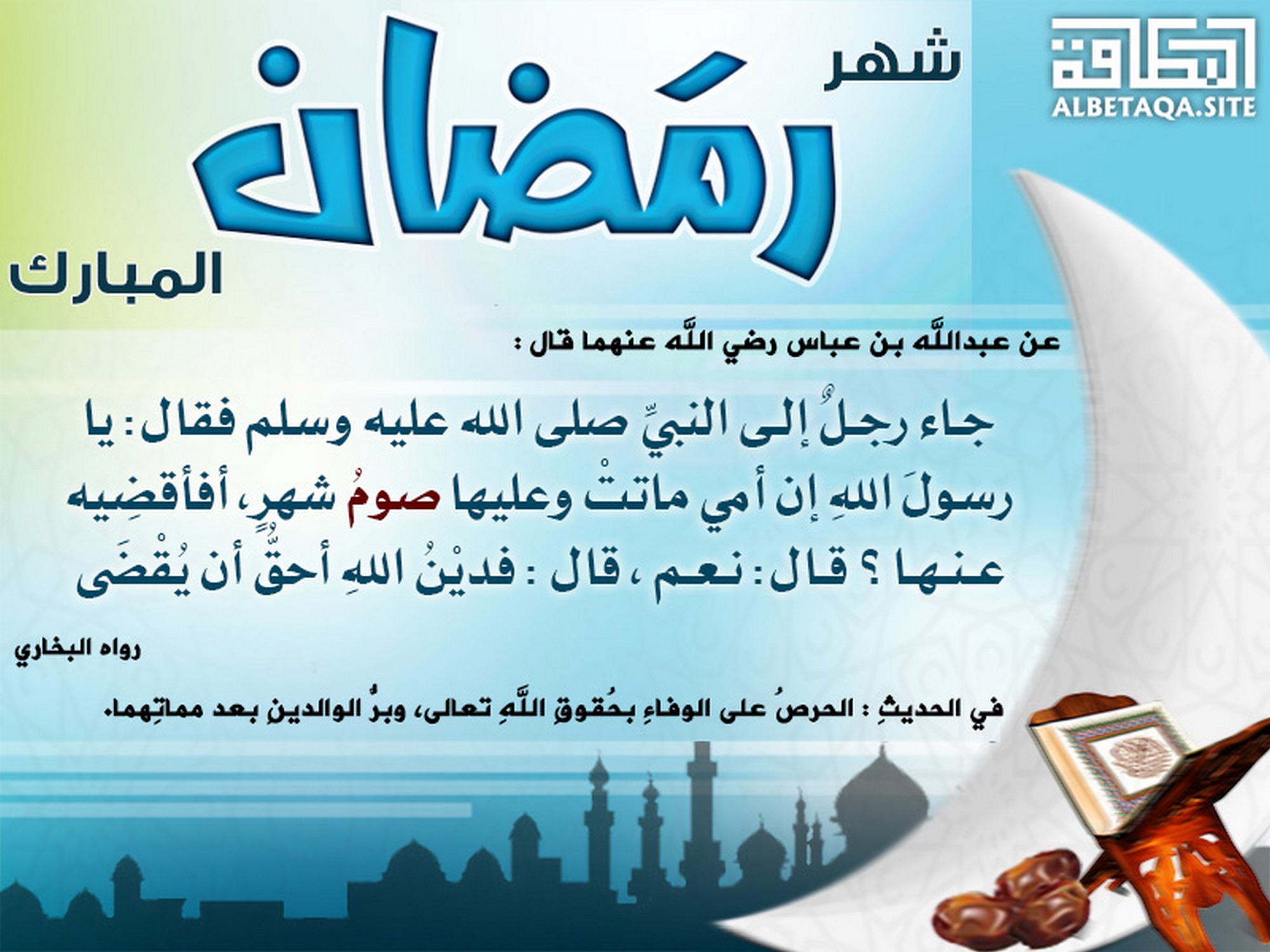 (جاء رجل إلى النبي صلى الله عليه وسلم فقال: يا رسول الله إن أمي ماتت وعليها صوم شهر، أفأقضيه عنها ؟ قال: نعم، قال: فدين الله أحق أن يقضى). رواه البخاري