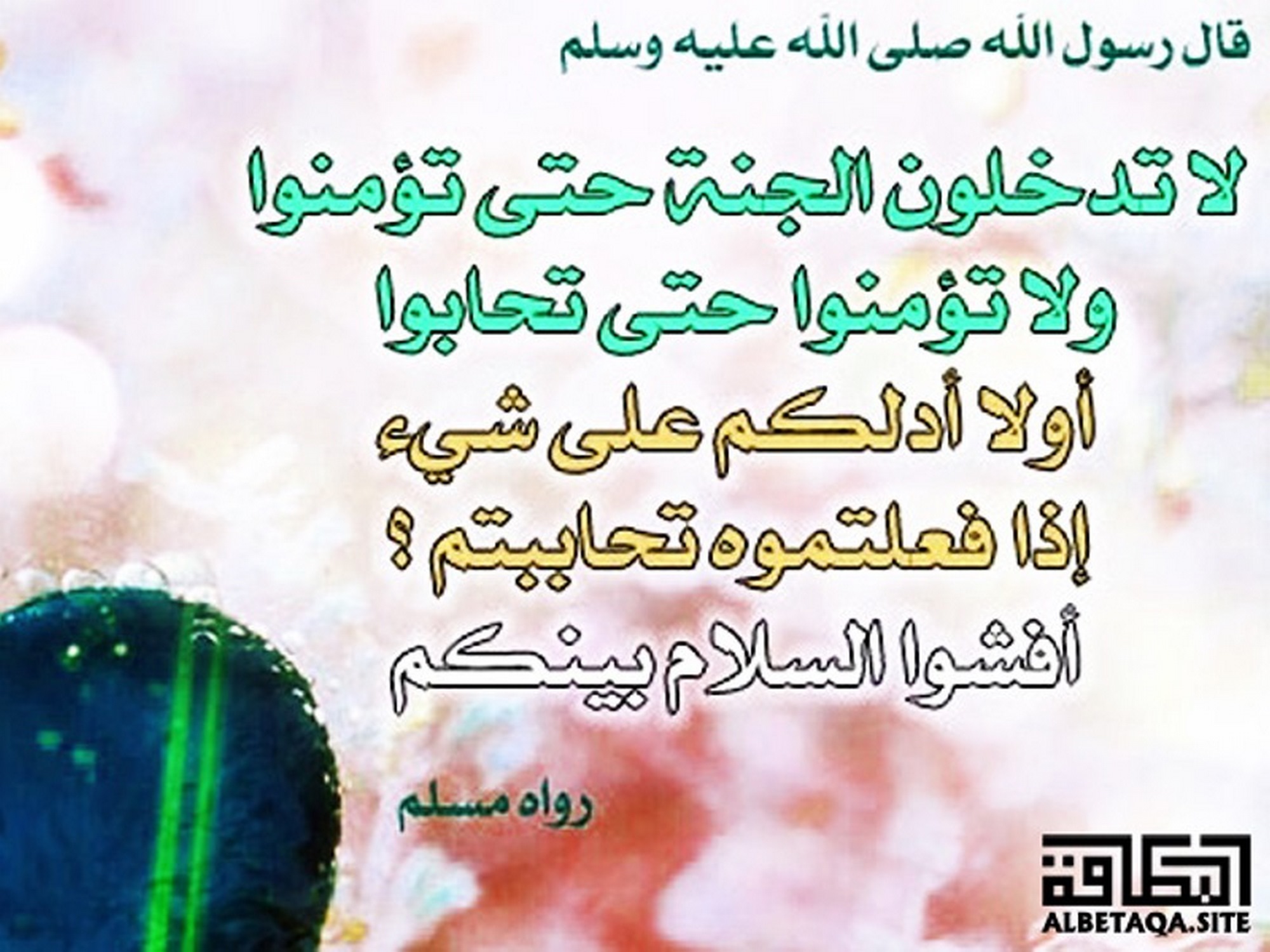 (لا تدخلون الجنة حتى تؤمنوا ولا تؤمنوا حتى تحابوا أولا أدلكم على شيئ إذا فعلتموه تحاببتم؟ أفشوا السلام بينكم). رواه مسلم