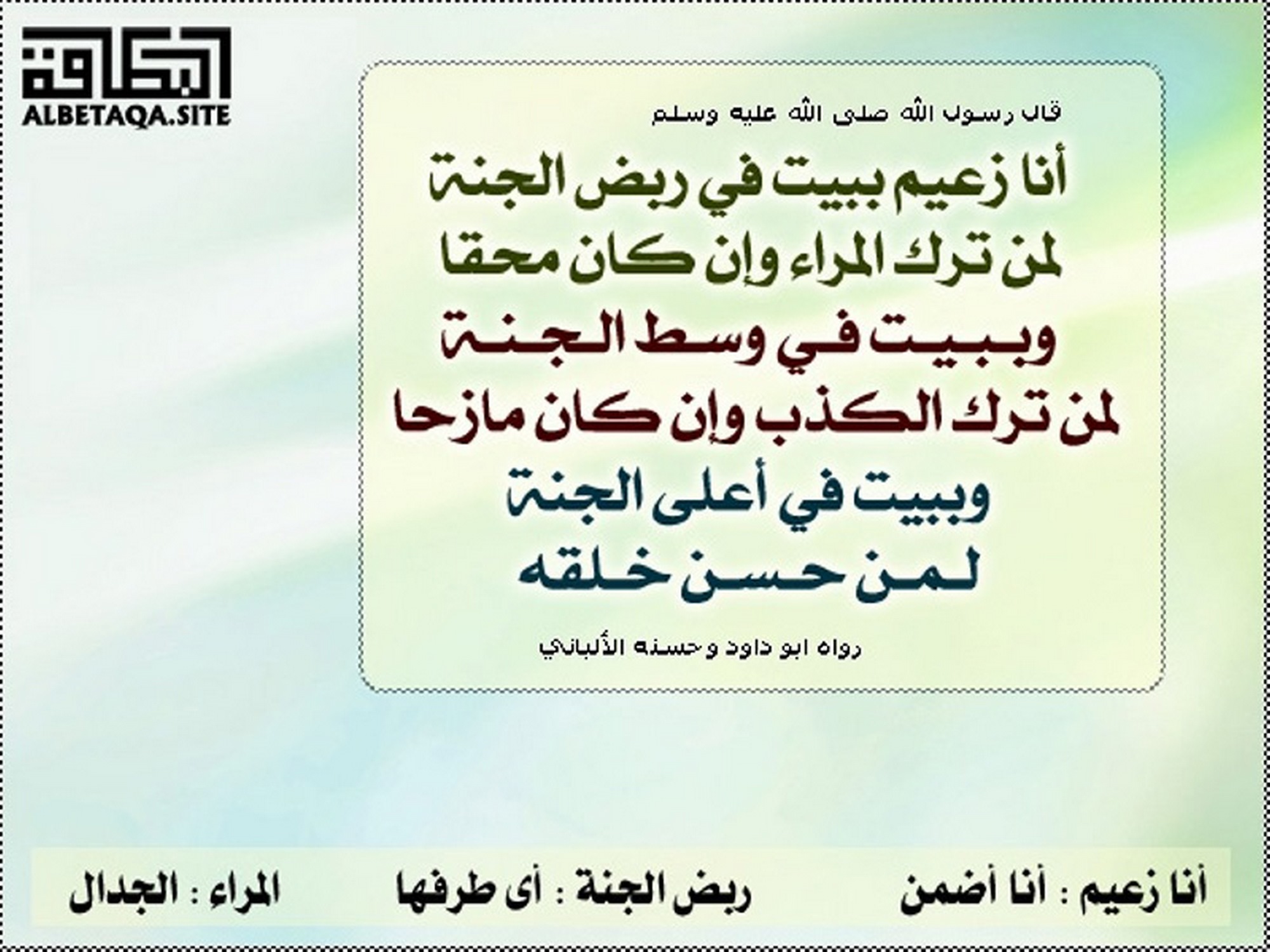 (أنا زعيم ببيت في ربض الجنة لمن ترك المراء وإن كان محقا وببيت في وسط الجنة لمن ترك الكذب وإن كان مازحا وببيت في أعلى الجنة لمن حسن خلقه). رواه أبو داود وحسنه الألباني