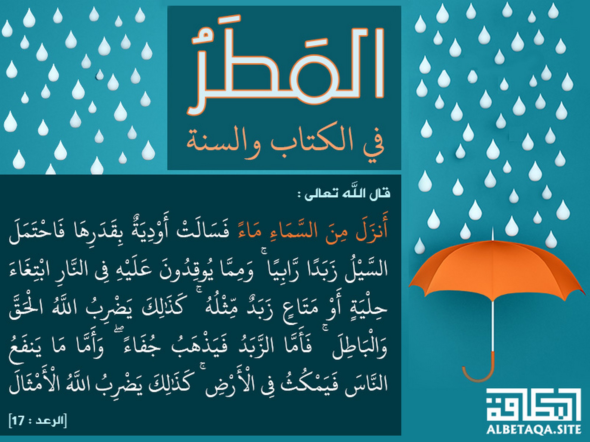 (أنزل من السماء ماء فسالت أودية بقدرها فاحتمل السيل زبدا رابيا ومما يوقدون عليه في النار ابتغاء حلية أو متاع زبد مثله كذلك يضرب الله الحق والباطل فأما الزبد فيذهب جفاء وأما ما ينفع الناس فيمكث في الأرض كذلك يضرب الله الأمثال). [الرعد: 17]