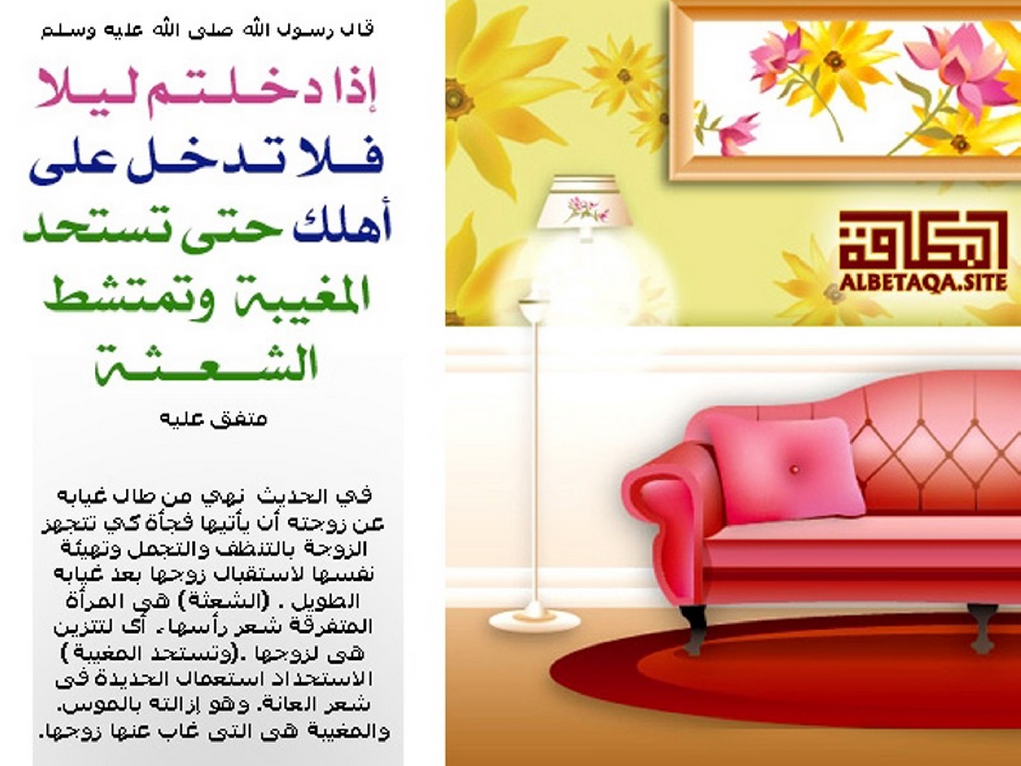 (إذا دخلتم ليلا فلا تدخل على أهلك حتى تستحد المغيبة وتمتشط الشعثة). متفق عليه