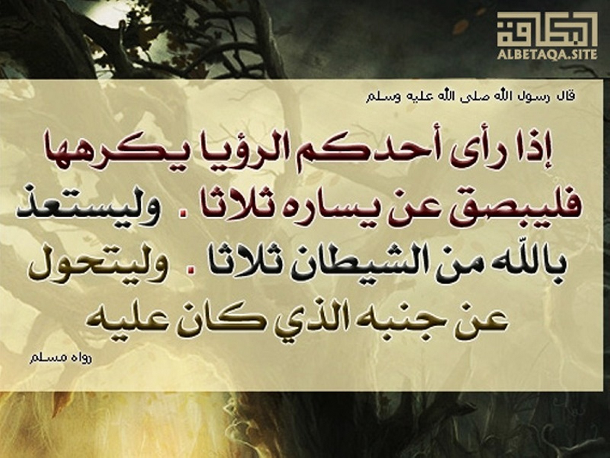 (إذا رأى أحدكم الرؤيا يكرهها فليبصق عن يساره ثلاثا. وليستعذ بالله من الشيطان ثلاثا. وليتحول عن جنبه الذي كان عليه). رواه مسلم