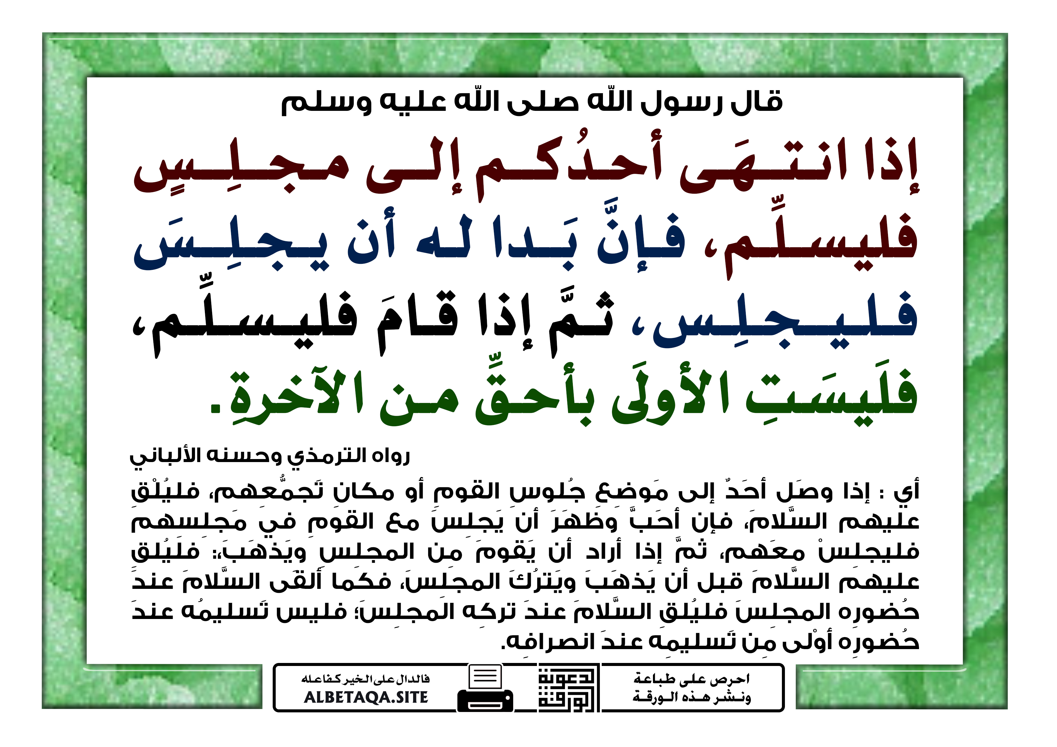 (إذا انتهى أحدكم إلى مجلس فليسلم، فإن بدا له أن يجلس فليجلس، ثم إذا قام فليسلم فليست الأولى بأحق من الآخرة). رواه الترمذي وحسنه الألباني
