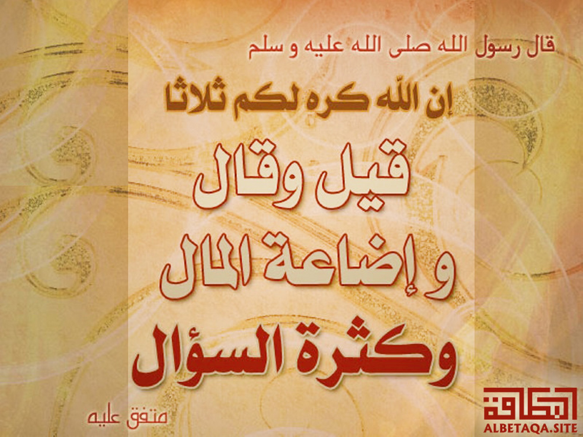 (إن الله كره لكم ثلاثا قيل وقال وإضاعة المال وكثرة السؤال).متفق عليه