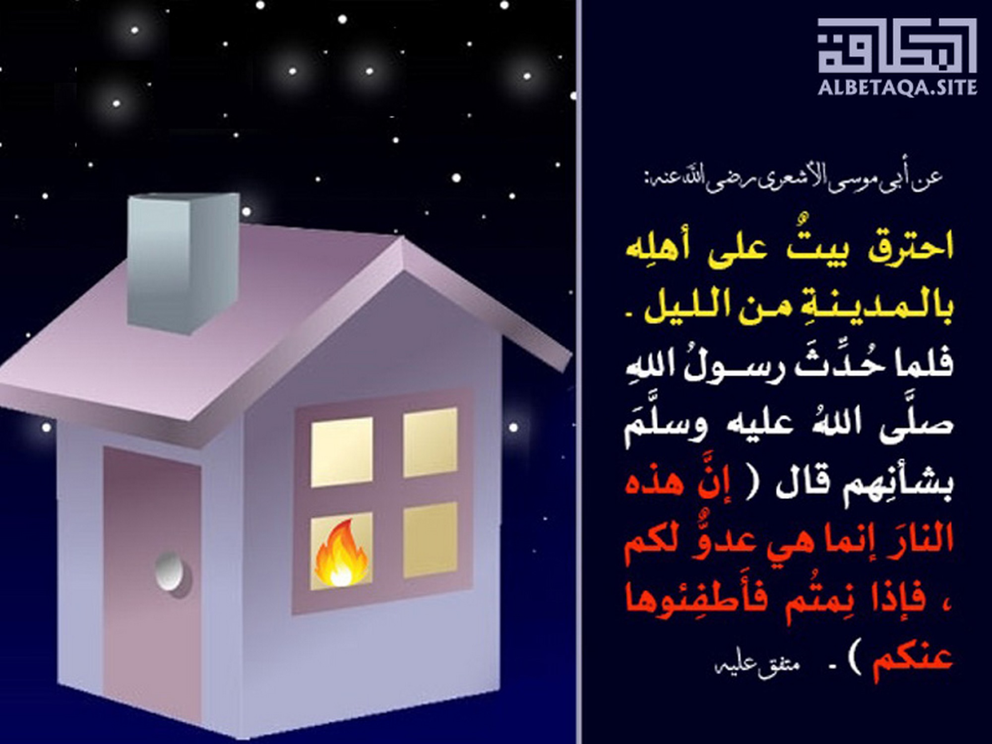 احترق بيت على أهله بالمدينة من الليل. فلما حدث رسول الله صلى الله عليه وسلم بشأنهم قال (إن هذه النار إنما هي عدو لكم. فإذا نمتم فأطفئوها عنكم). متفق عليه