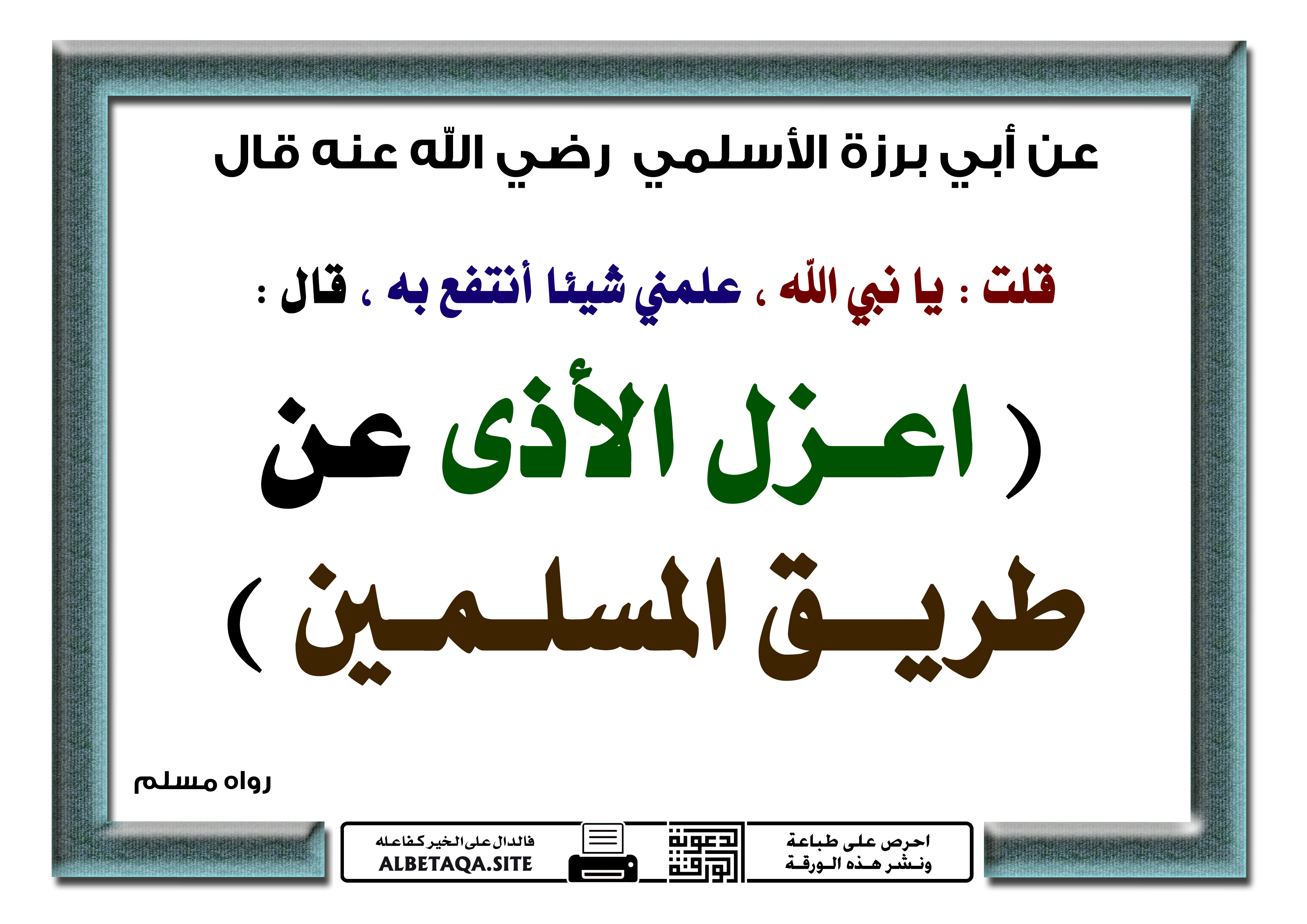 عن أبي برزة الأسلمي رضي الله عنه قال: قلت: يا نبي الله، علمني شيئا أنتفع به، قال: (اعزل الأذى عن طريق المسلمين). رواه مسلم