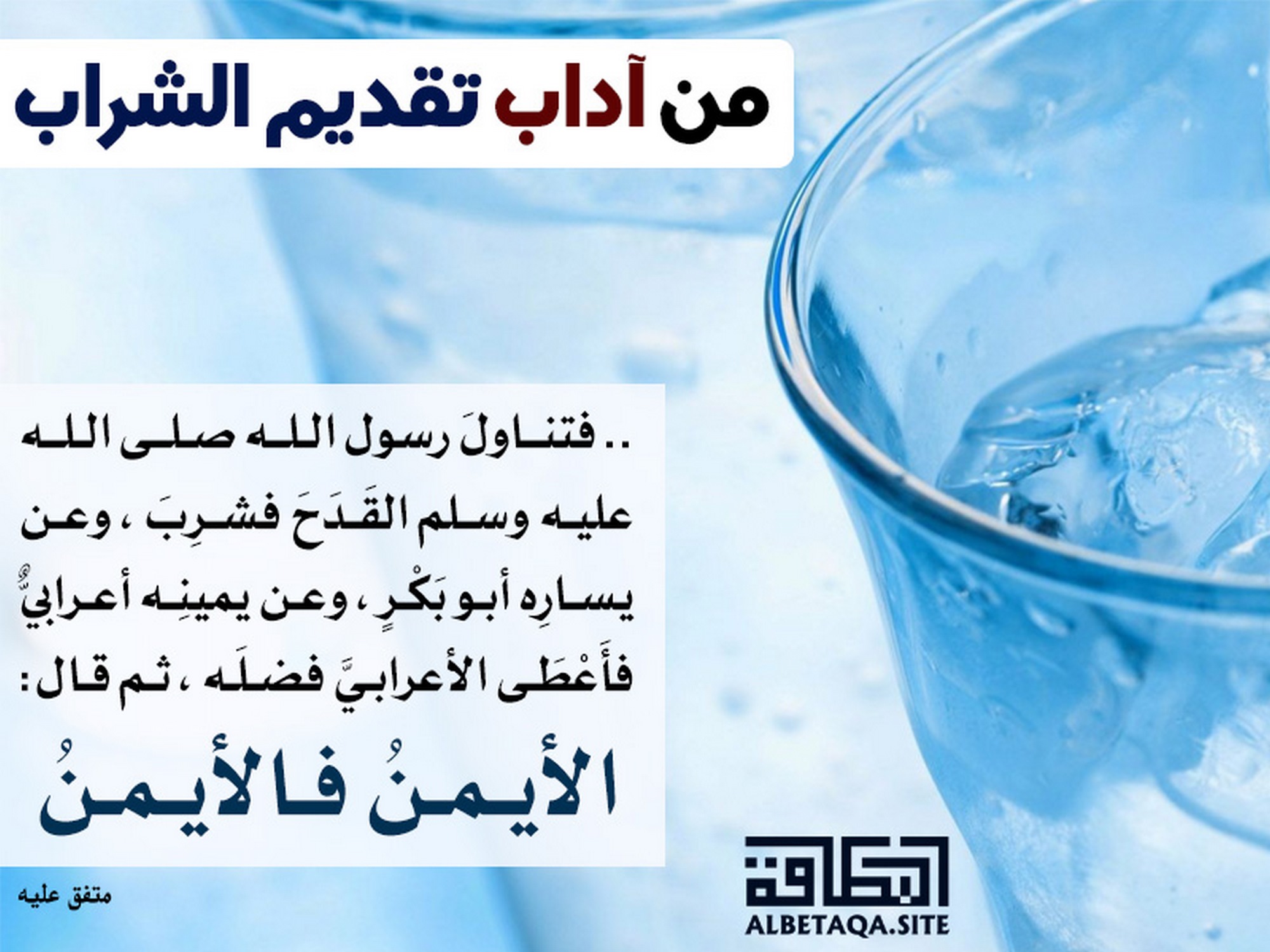 (.. فتناول رسول الله صلى الله عليه وسلم القدح فشرب، وعن يساره أبو بكر، وعن يمينه أعرابي، فأعطى الأعرابي فضله، ثم قال: الأيمن فالأيمن). متفق عليه