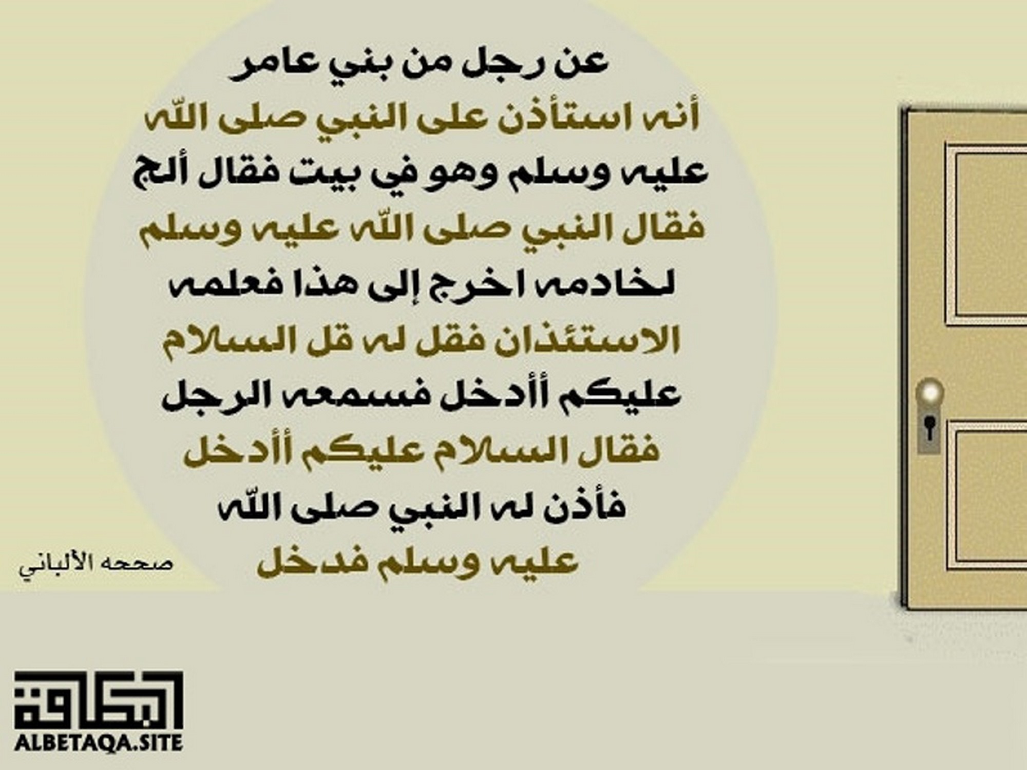 أنه استأذن على النبي صلى الله عليه وسلم وهو في بيت فقال ألج فقال النبي صلى الله عليه وسلم لخادمه أخرج إلى هذا فعلمه الاستئذان فقل له قل: السلام عليكم أأدخل فسمعه الرجل فقال السلام عليكم أأدخل فأذن له النبي صلى الله عليه وسلم فدخل. صححه الألباني