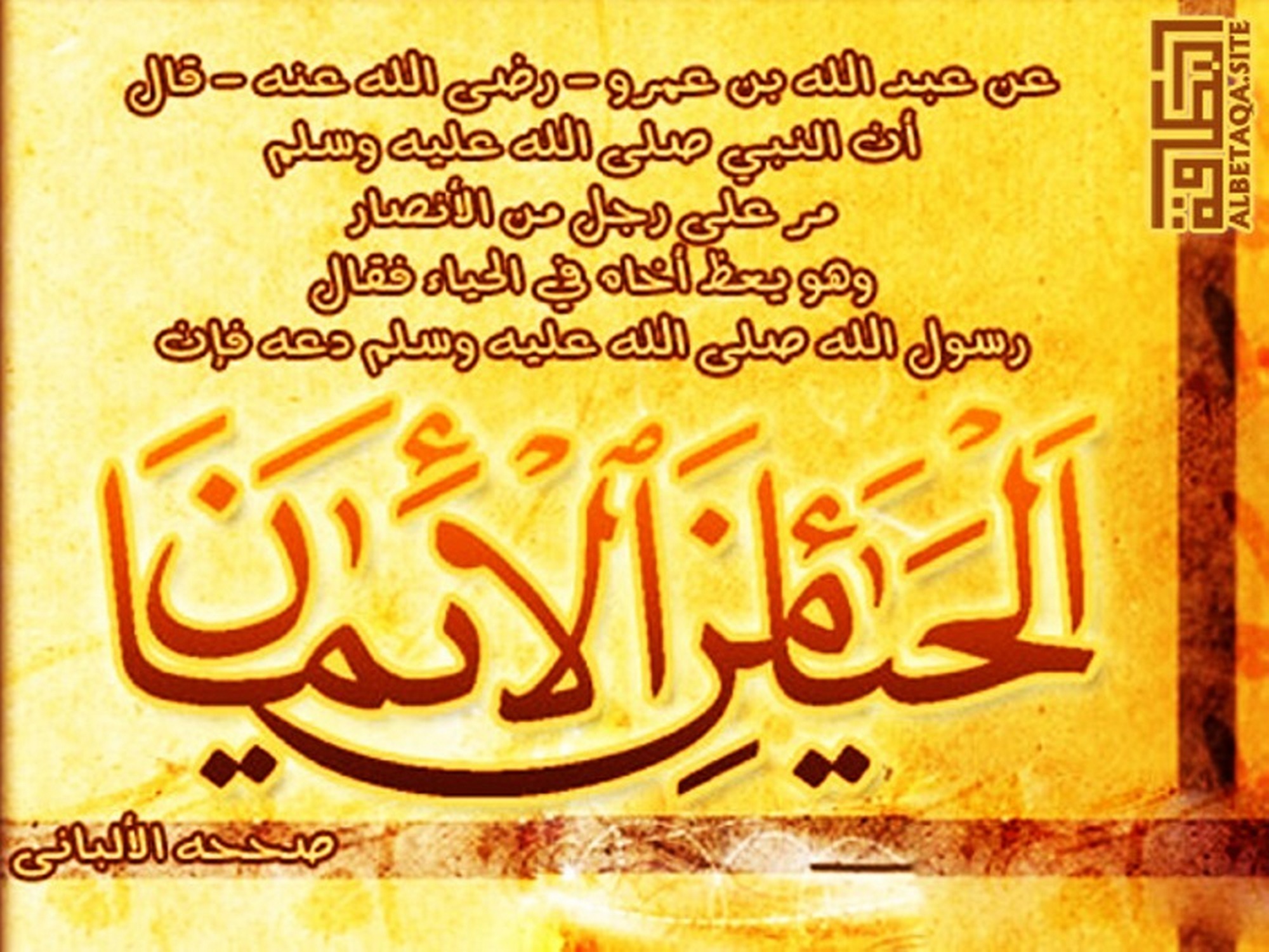 (أن النبي صلى الله عليه وسلم مر على رجل من الأنصار وهو يعظ أخاه في الحياء فقال رسول الله صلى الله عليه وسلم: دعه فإن الحياء من الإيمان). صححه الألباني