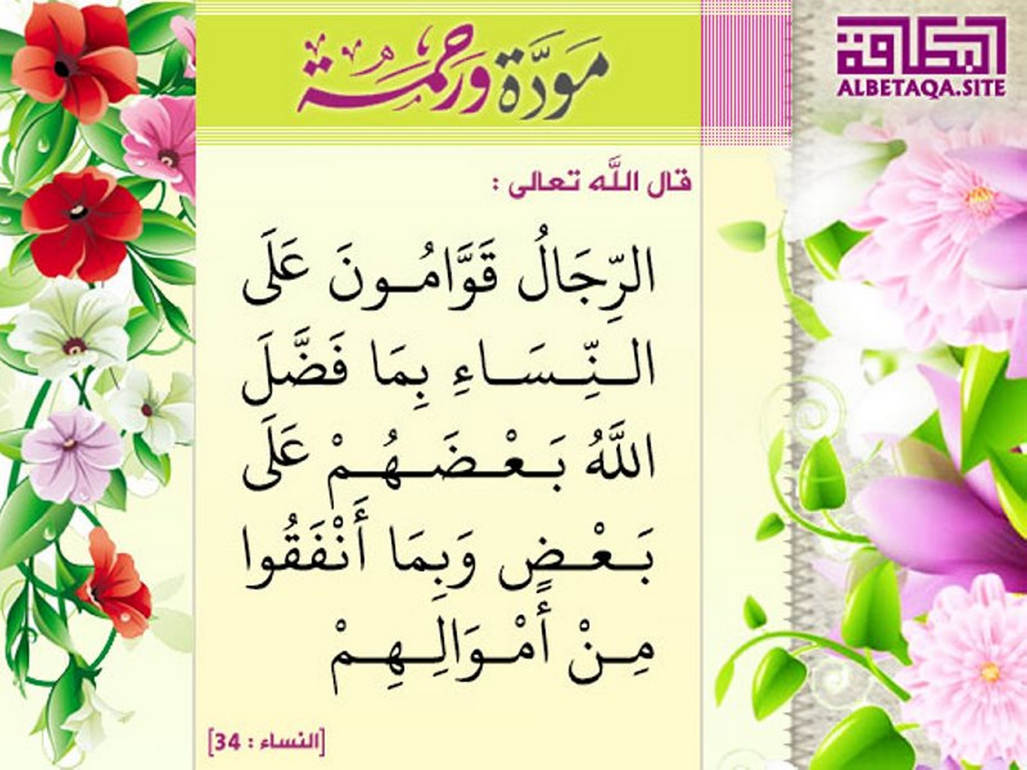 (الرجال قوامون على النساء بما فضل الله بعضهم على بعض وبما أنفقوا من أموالهم). [النساء : 34]