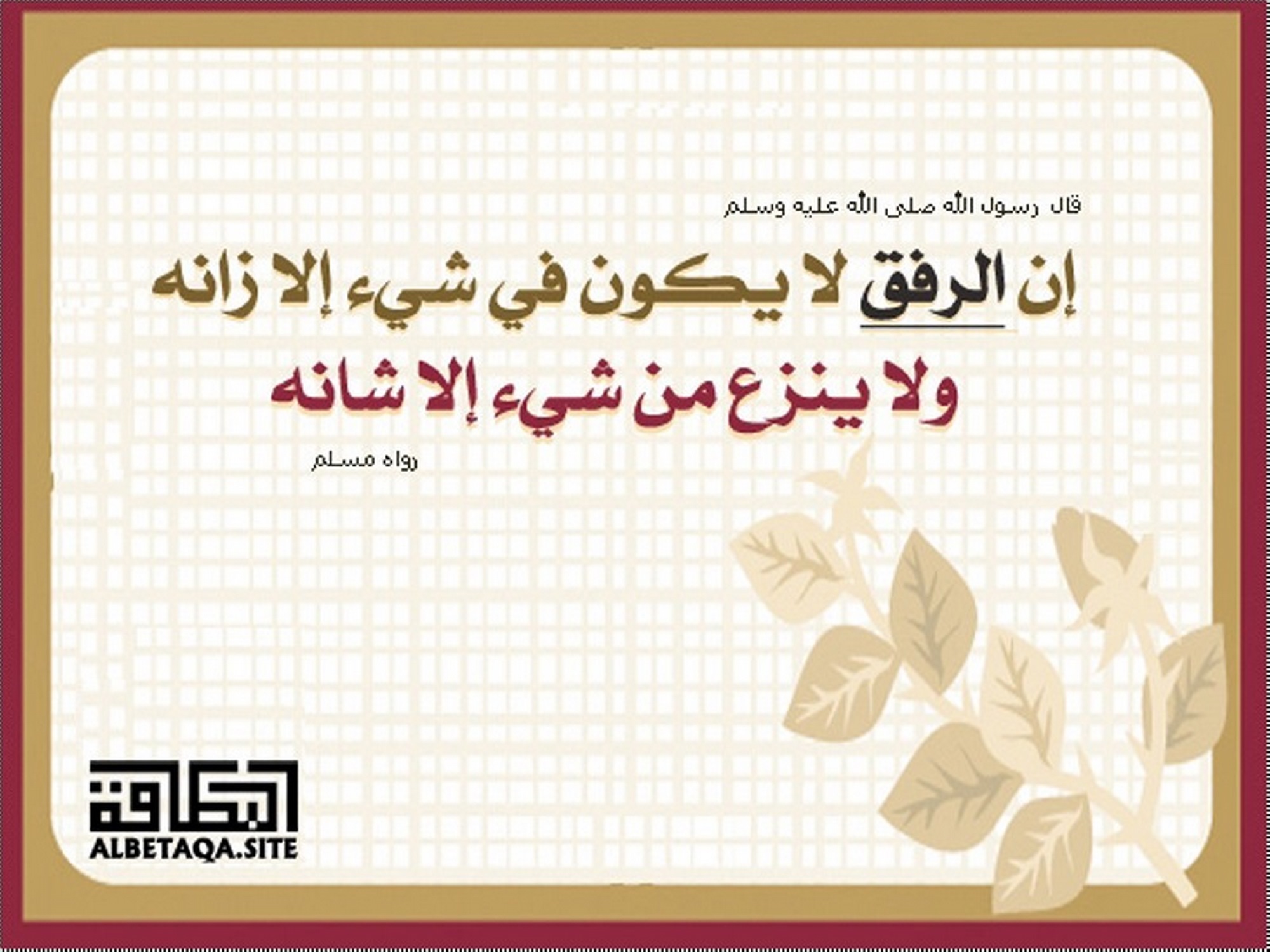 (إن الرفق لا يكون في شيء إلا زانه. ولا ينزع من شيء إلا شانه). رواه مسلم