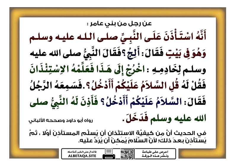 (أنه استأذن على النبي صلى الله عليه وسلم وهو في بيت فقال ألج فقال النبي صلى الله عليه وسلم لخادمه: اخرج إلى هذا فعلمه الاستئذان، فقل له: قل: السلام عليكم أأدخل؟ فسمعه الرجل، فقال: السلام عليكم، أأدخل؟ فأذن له النبي صلى الله عليه وسلم، فدخل). رواه أبو داود وصححه الألباني