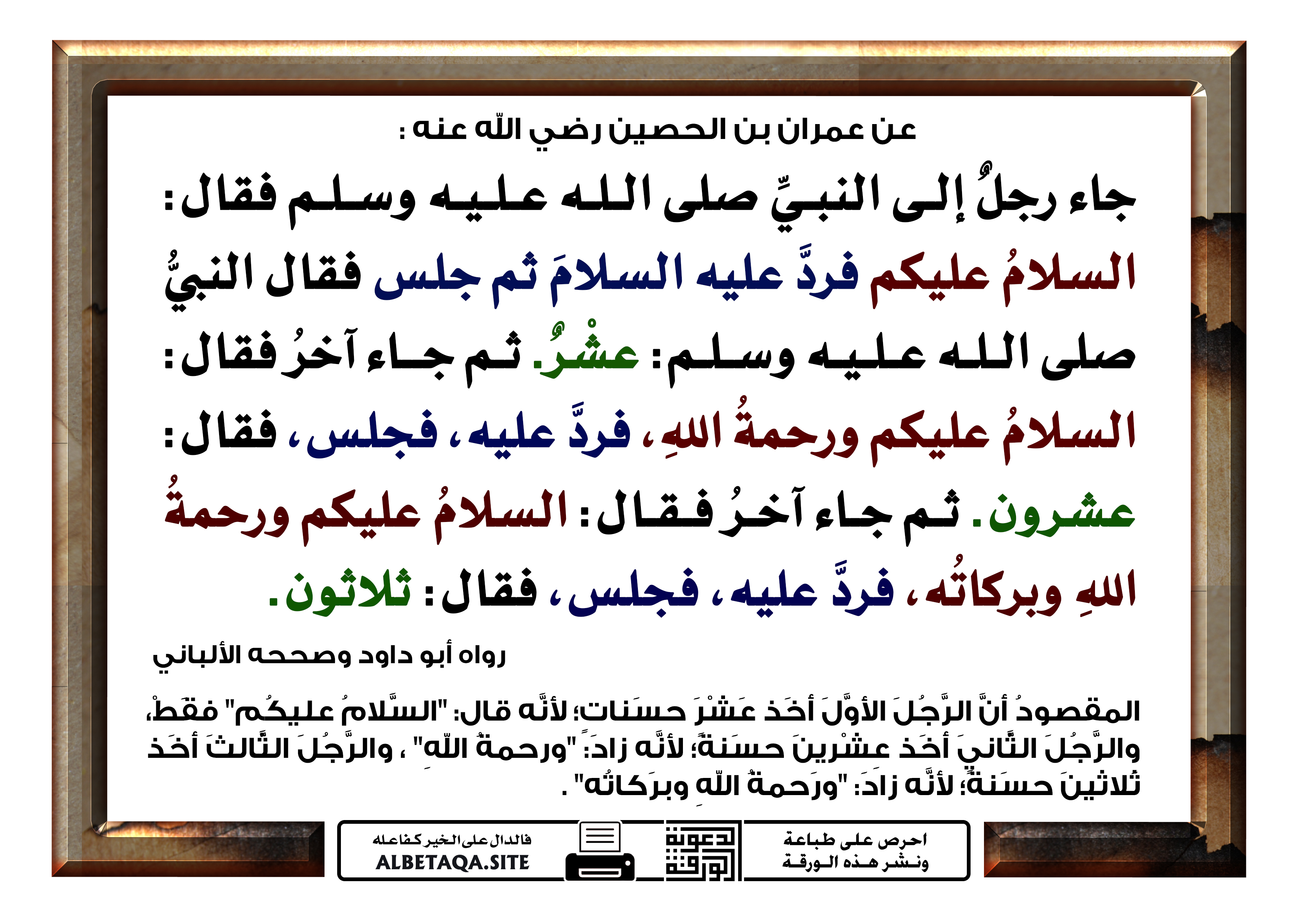 (جاء رجل إلى النبي صلى الله عليه وسلم فقال: السلام عليكم فرد عليه السلام ثم جلس فقال النبي صلى الله عليه وسلم عشر. ثم جاء آخر فقال: السلام عليكم ورحمة الله، فرد عليه، فجلس، فقال: عشرون. ثم جاء آخر فقال: السلام عليكم ورحمة الله وبركاته، فرد عليه، فجلس، فقال: ثلاثون). رواه أبو داود وصححه الألباني