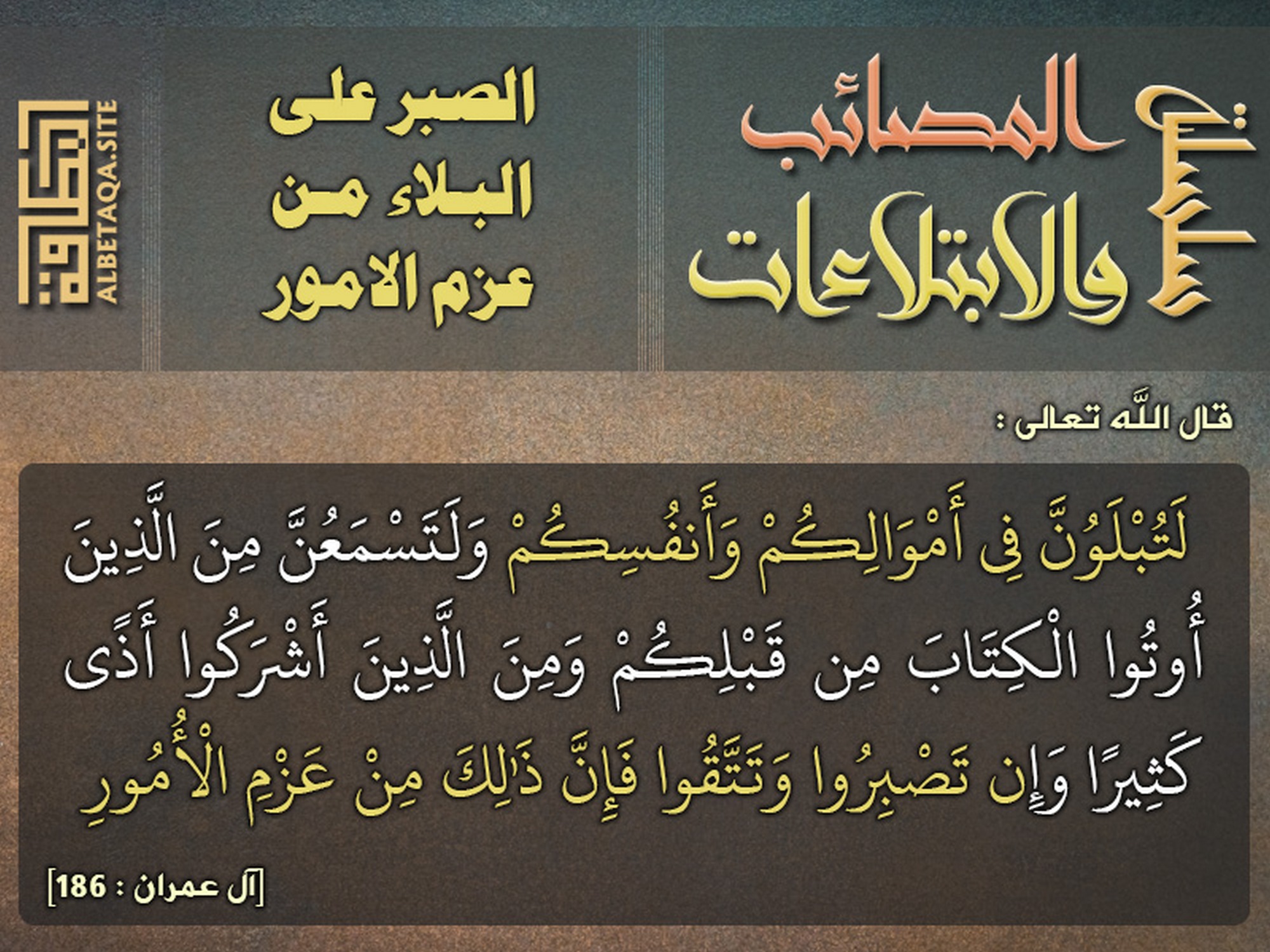 (لتبلون في أموالكم وأنفسكم ولتسمعن من الذين أوتوا الكتاب من قبلكم ومن الذين أشركوا أذى كثيرا وإن تصبروا وتتقوا فإن ذلك من عزم الأمور). [آل عمران : 186]