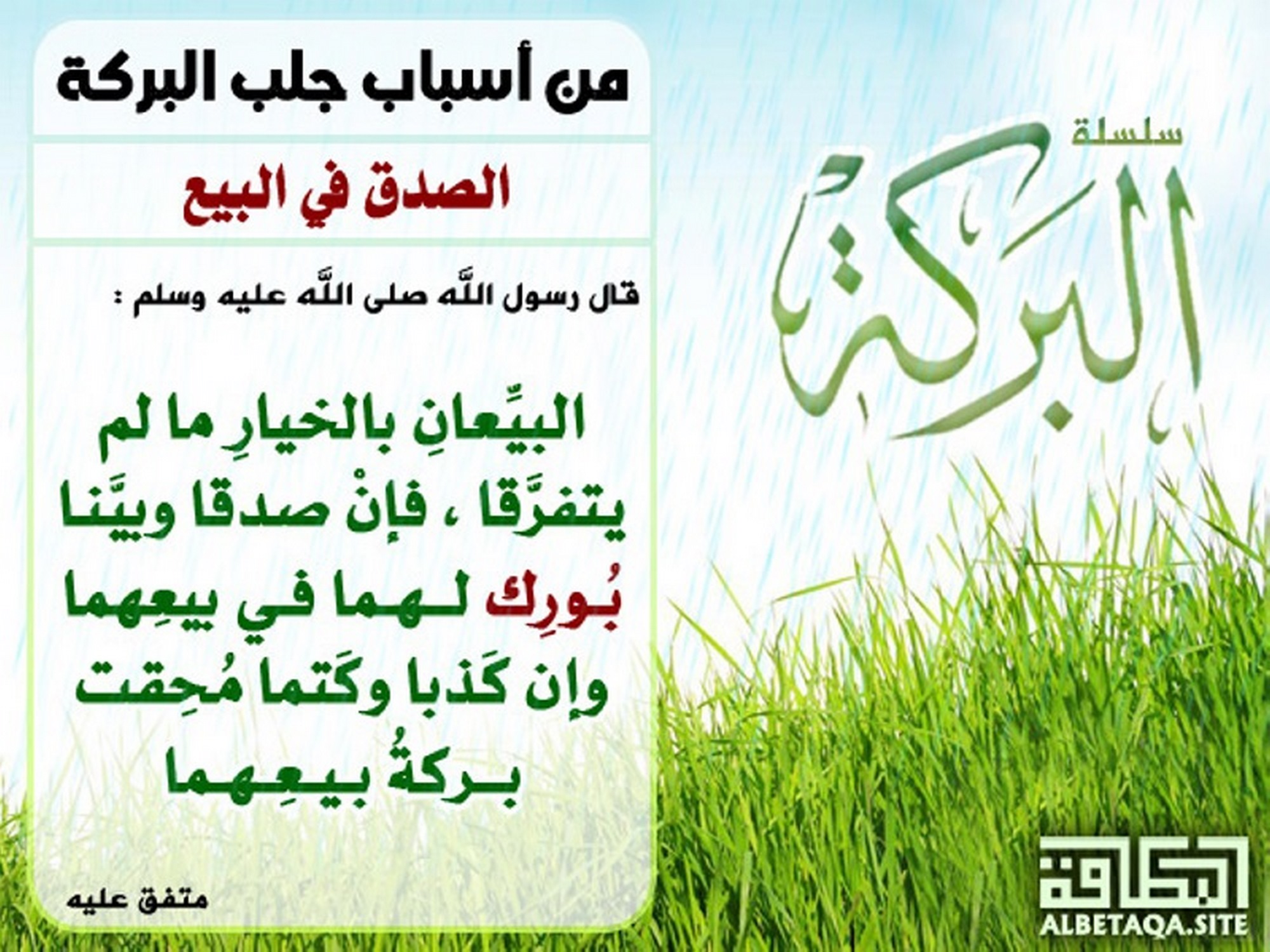 (البيعان بالخيار ما لم يتفرقا ، فإن صدقا وبينا بورك لهما في بيعهما وإن كذبا وكتما محقت بركة بيعهما). متفق عليه