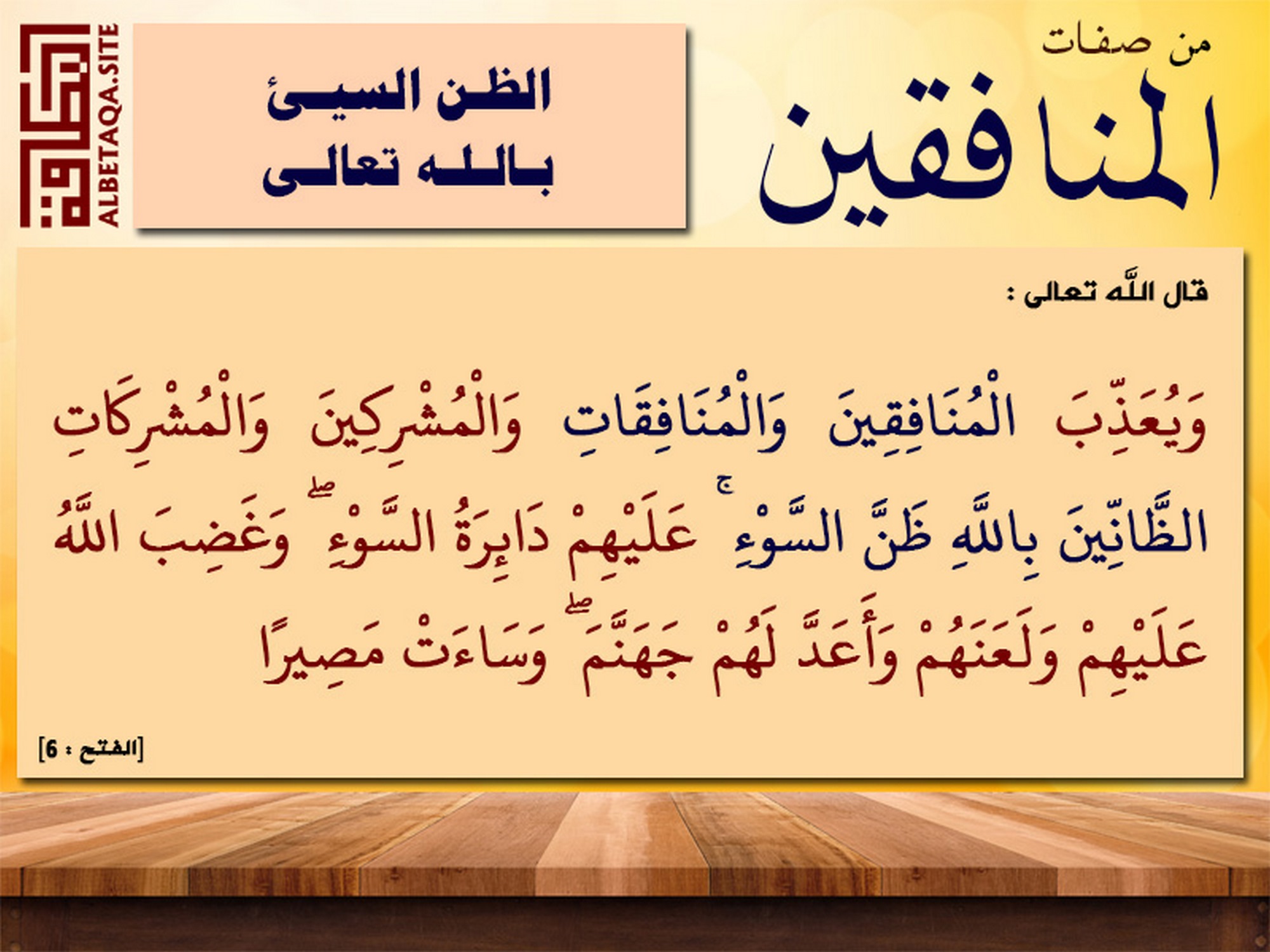 (ويعذب المنافقين والمنافقات والمشركين والمشركات الظانين بالله ظن السوء عليهم دائرة السوء وغضب الله عليهم ولعنهم وأعد لهم جهنم وساءت مصيرا). [الفتح: 6]