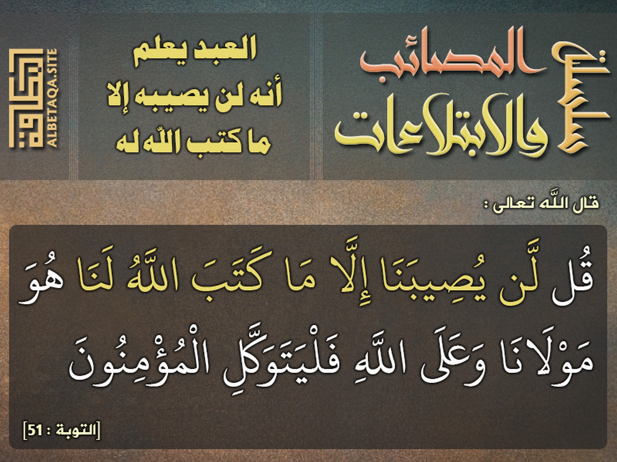 (قل لن يصيبنا إلا ما كتب الله لنا هو مولانا وعلى الله فليتوكل المؤمنون). [التوبة: 51]