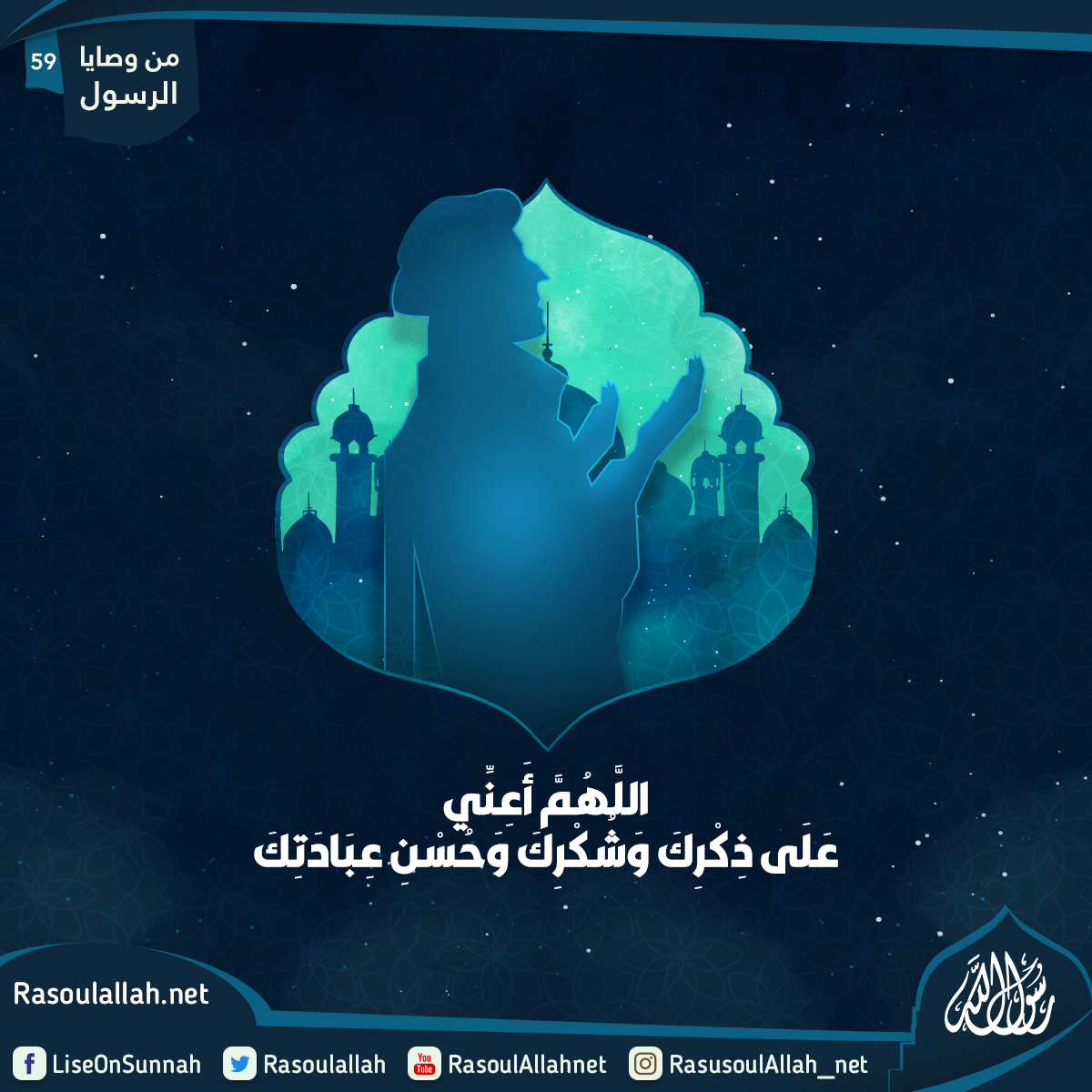 "يَا مُعَاذُ لَا تَدَعَنَّ فِي دُبُرِ كُلِّ صَلَاةٍ تَقُولُ: "اللَّهُمَّ أَعِنِّي عَلَى ذِكْرِكَ وَشُكْرِكَ وَحُسْنِ عِبَادَتِكَ".