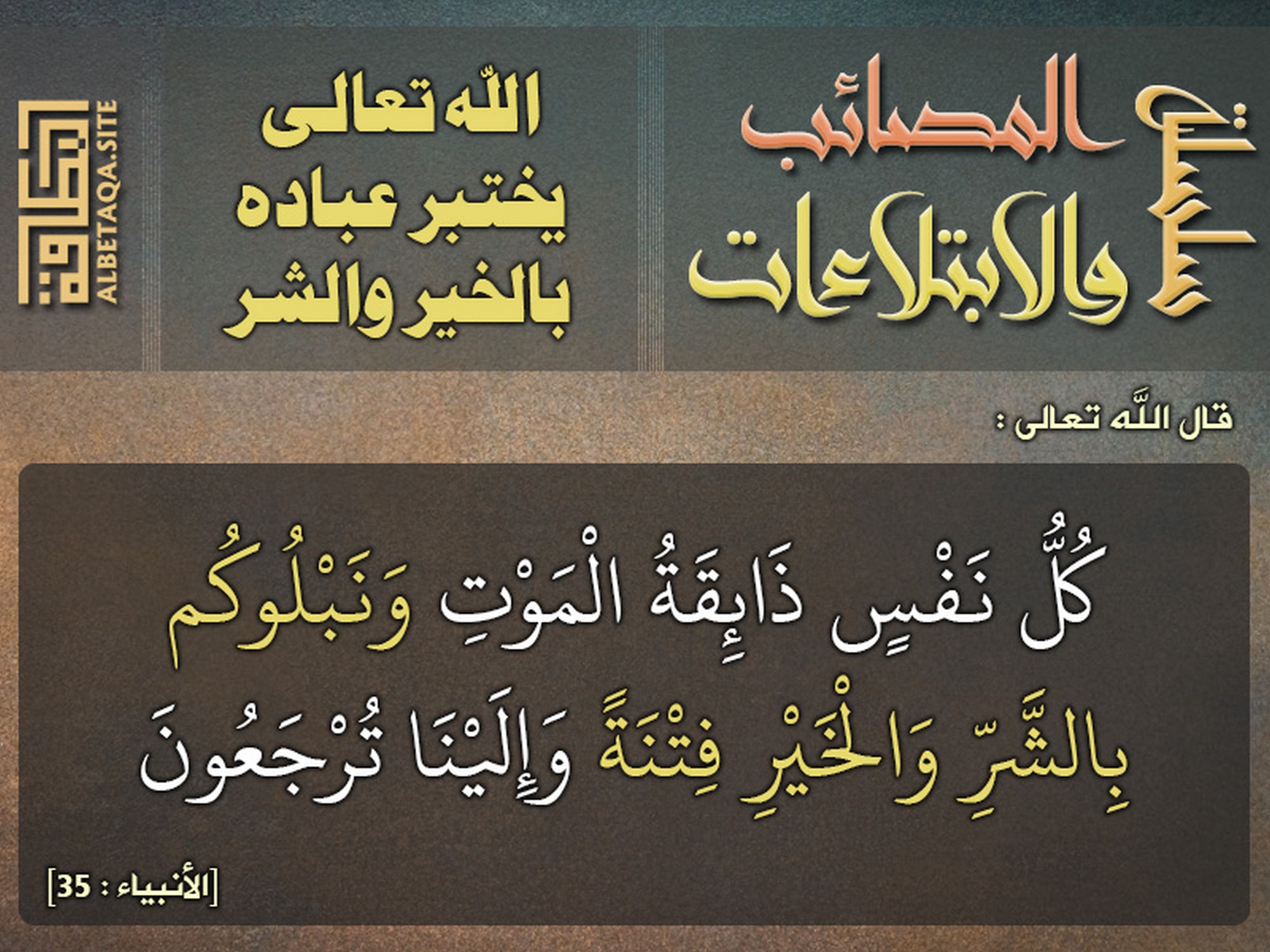 (كل نفس ذائقة الموت ونبلوكم بالشر والخير فتنة وإلينا ترجعون). [الأنبياء : 35]