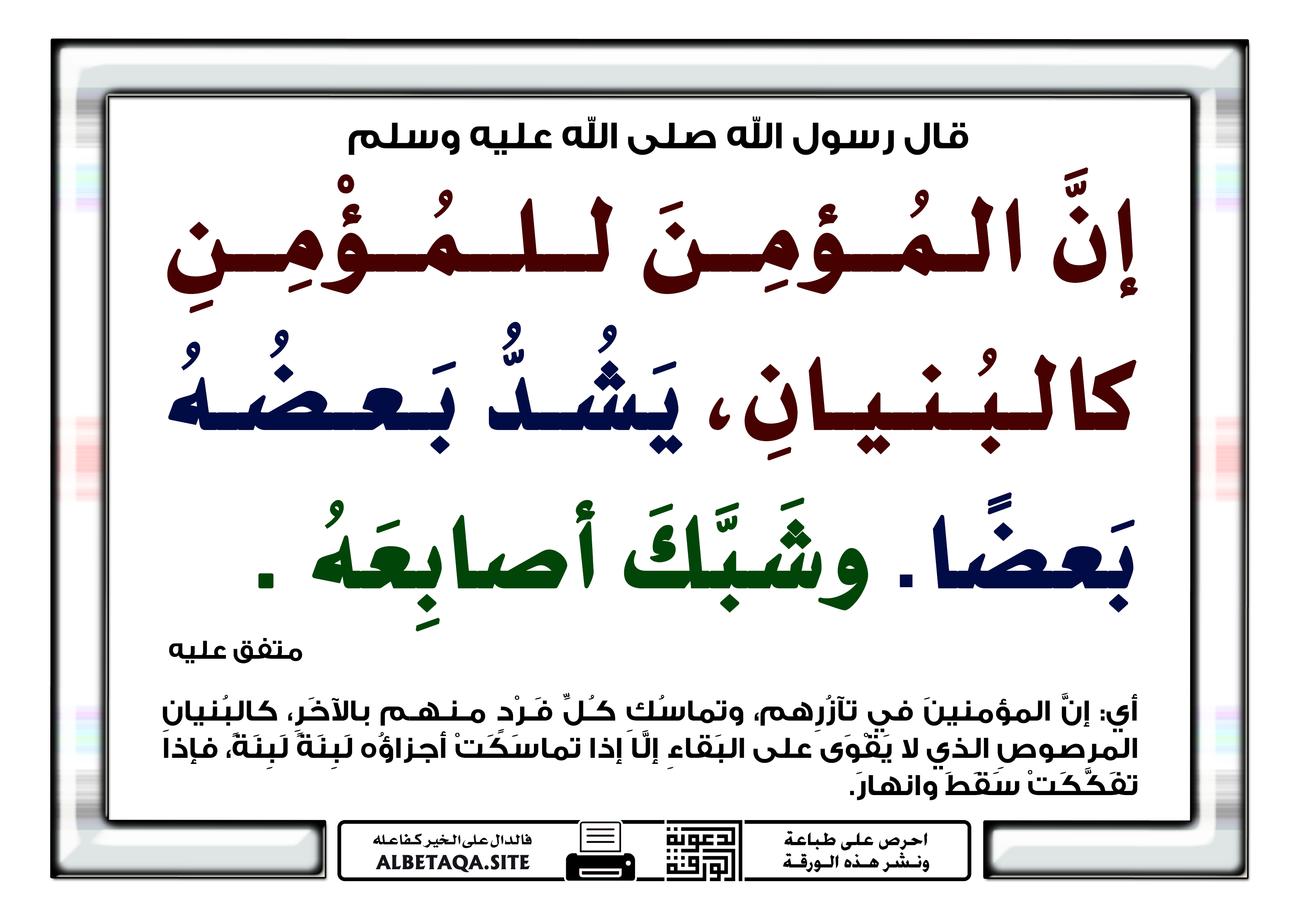 (إن المؤمن للمؤمن كالبنيان، يشد بعضه بعضا. وشبك أصابعه). متفق عليه