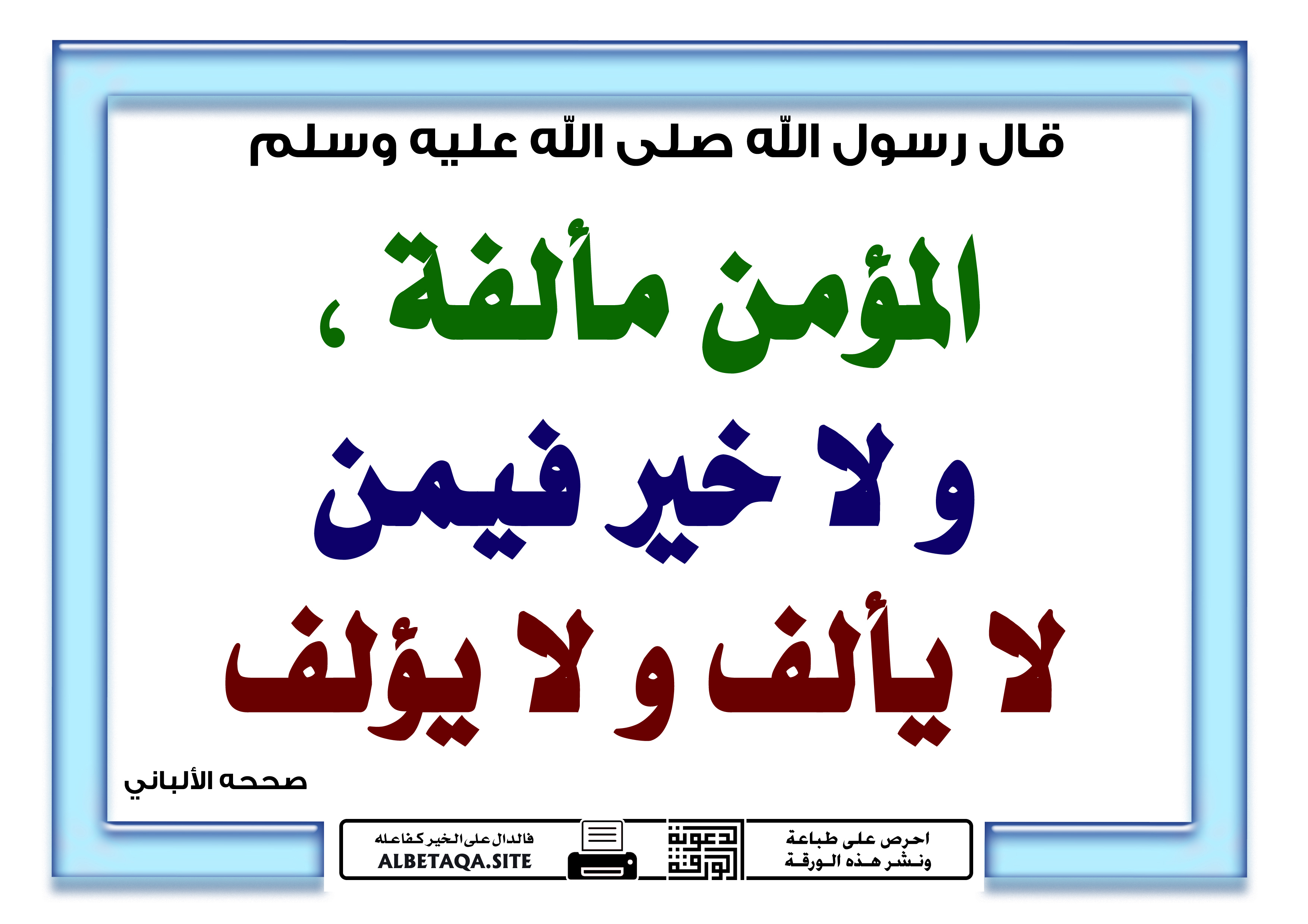 (المؤمن مألفة، ولا خير فيمن لا يألف ولا يؤلف). صححه الألباني