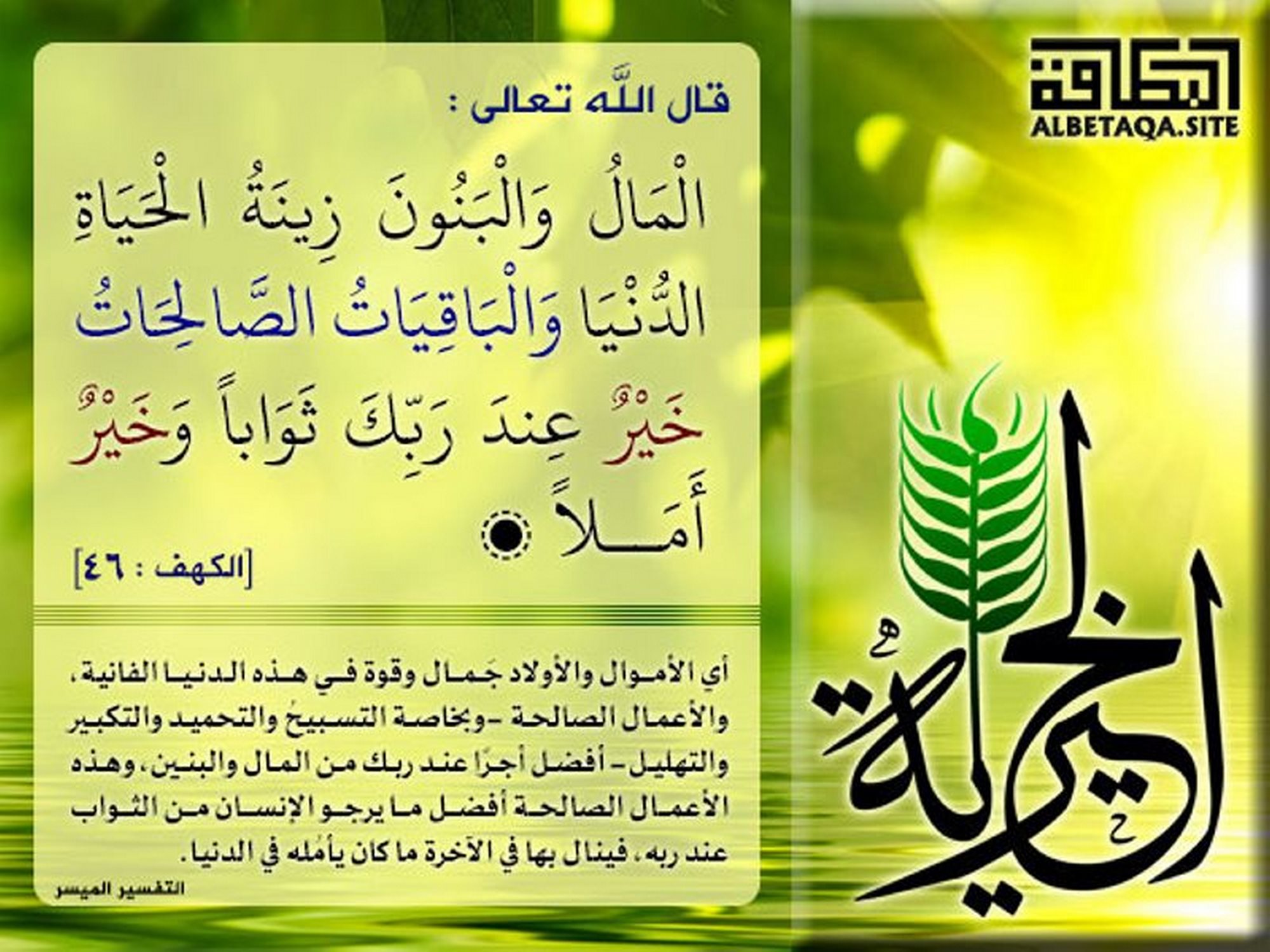 (المال والبنون زينة الحياة الدنيا والباقيات الصالحات خير عند ربك ثوابا وخير أملا). [الكهف : 46]