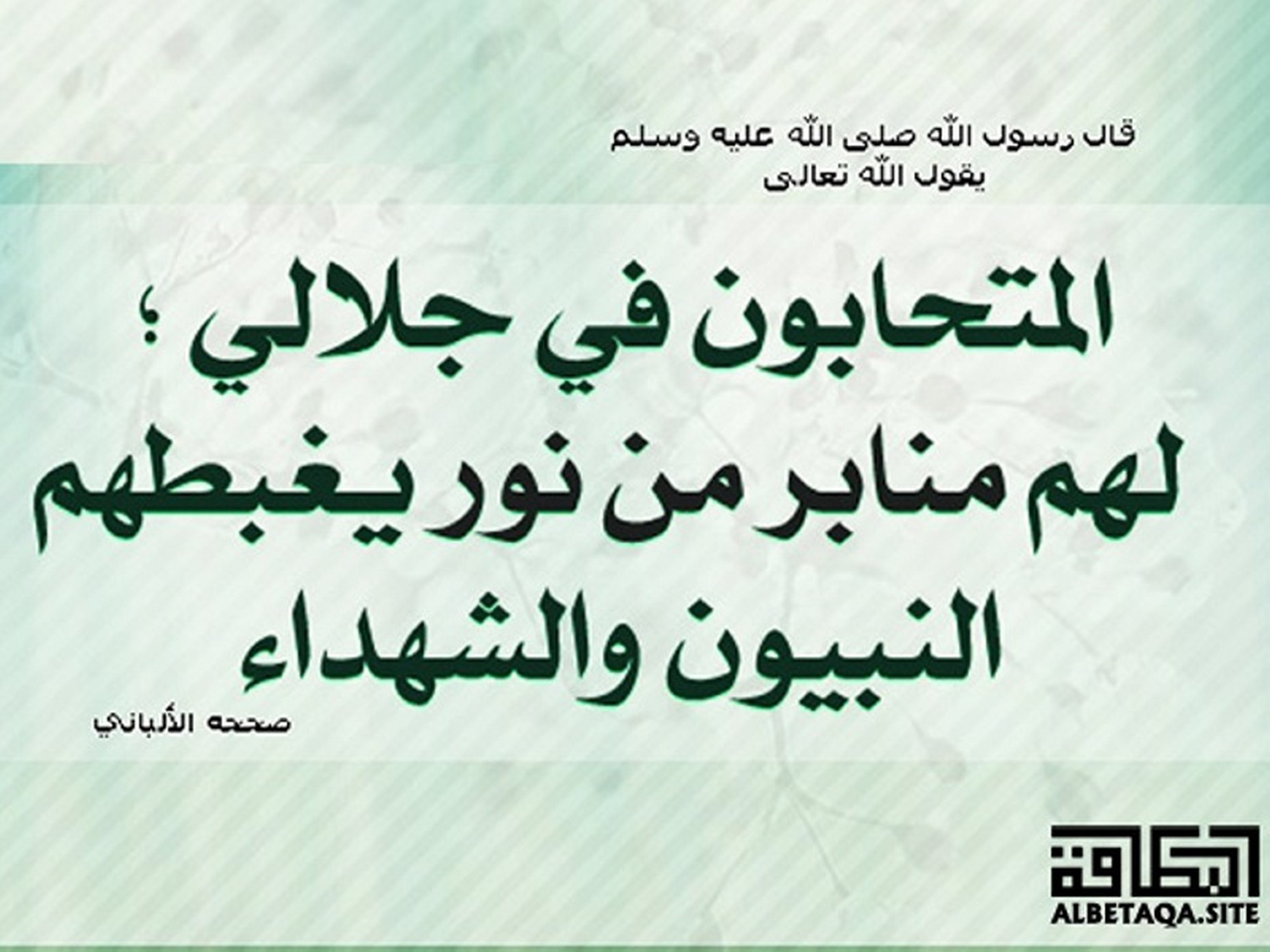 (يقول الله تعالى: المتحابون في جلالي لهم منابر من نور يغبطهم النبيون والشهداء). صححه الألباني