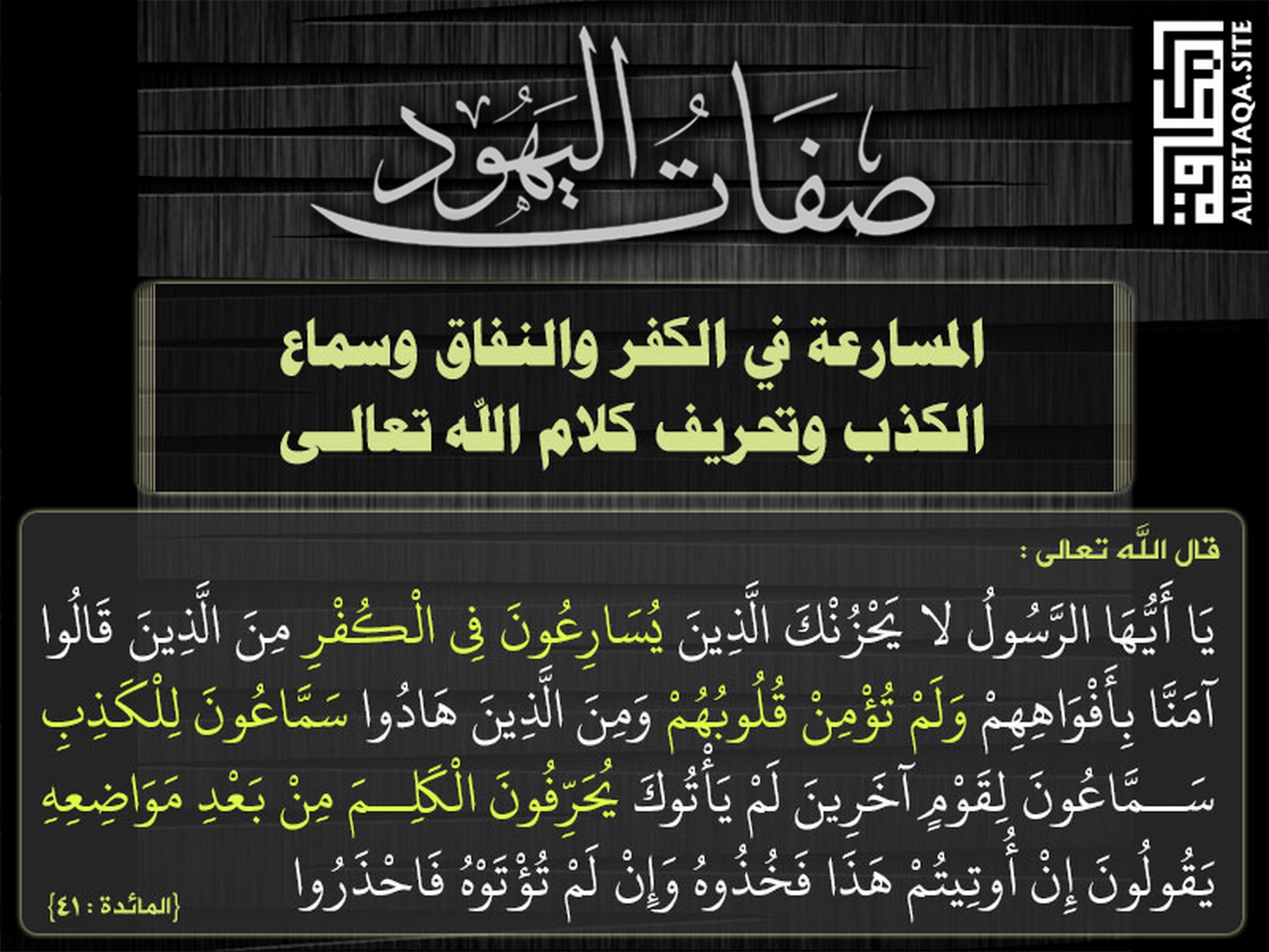 (يا أيها الرسول لا يحزنك الذين يسارعون في الكفر من الذين قالوا آمنا بأفواههم ولم تؤمن قلوبهم ومن الذين هادوا سماعون للكذب سماعون لقوم آخرين لم يأتوك يحرفون الكلم من بعد مواضعه يقولون إن أوتيتم هذا فخذوه وإن لم تؤتوه فاحذروا). {المائدة: 41}