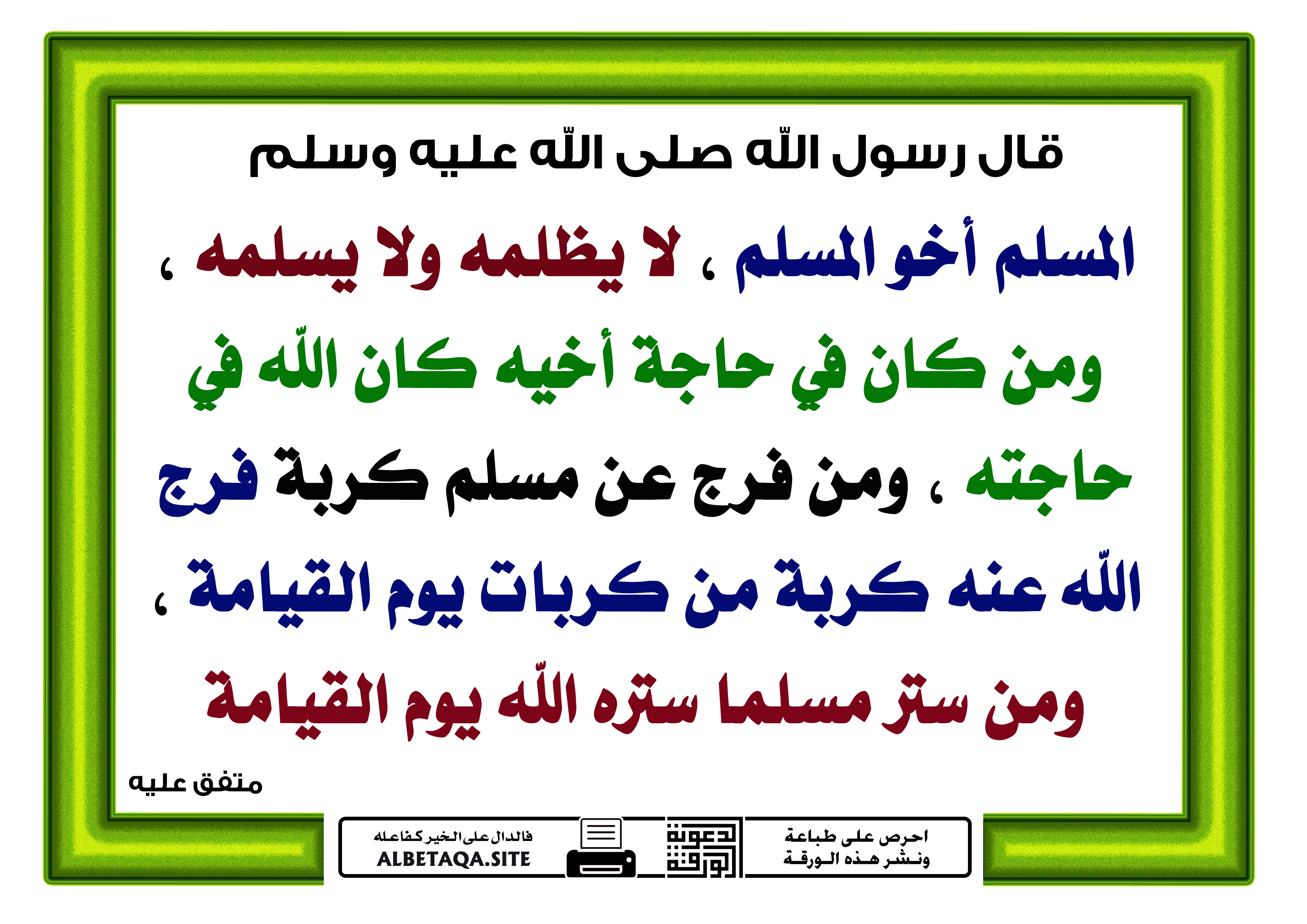 (المسلم أخو المسلم، لا يظلمه ولا يسلمه، ومن كان في حاجة أخيه كان الله في حاجته، ومن فرج عن مسلم كربة فرج الله عنه كربة من كربات يوم القيامة، ومن ستر مسلما ستره الله يوم القيامة). متفق عليه