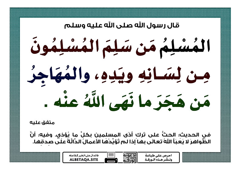 (المسلم من سلم المسلمون من لسانه ويده، والمهاجر من هجر ما نهى الله عنه). متفق عليه