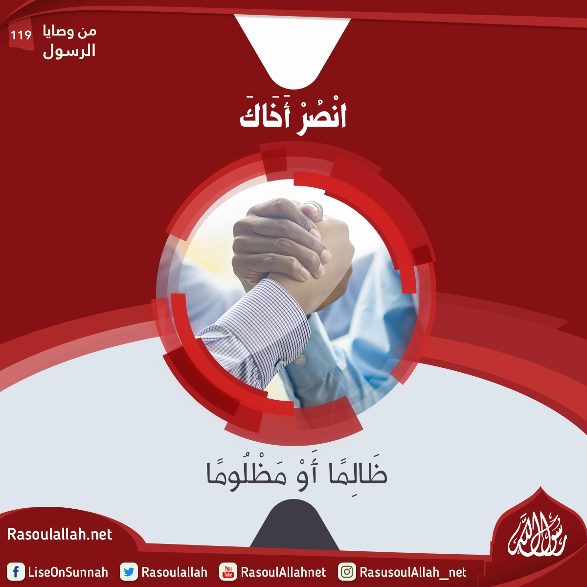 قَالَ رَسُولُ اللَّهِ صَلَّى اللَّهُ عَلَيْهِ وَسَلَّمَ "انْصُرْ أَخَاكَ ظَالِمًا أَوْ مَظْلُومًا" قَالُوا: يَا رَسُولَ اللَّهِ، هَذَا نَنْصُرُهُ مَظْلُومًا فَكَيْفَ نَنْصُرُهُ ظَالِمًا؟ قَالَ: "تَأْخُذُ فَوْقَ يَدَيْهِ".
