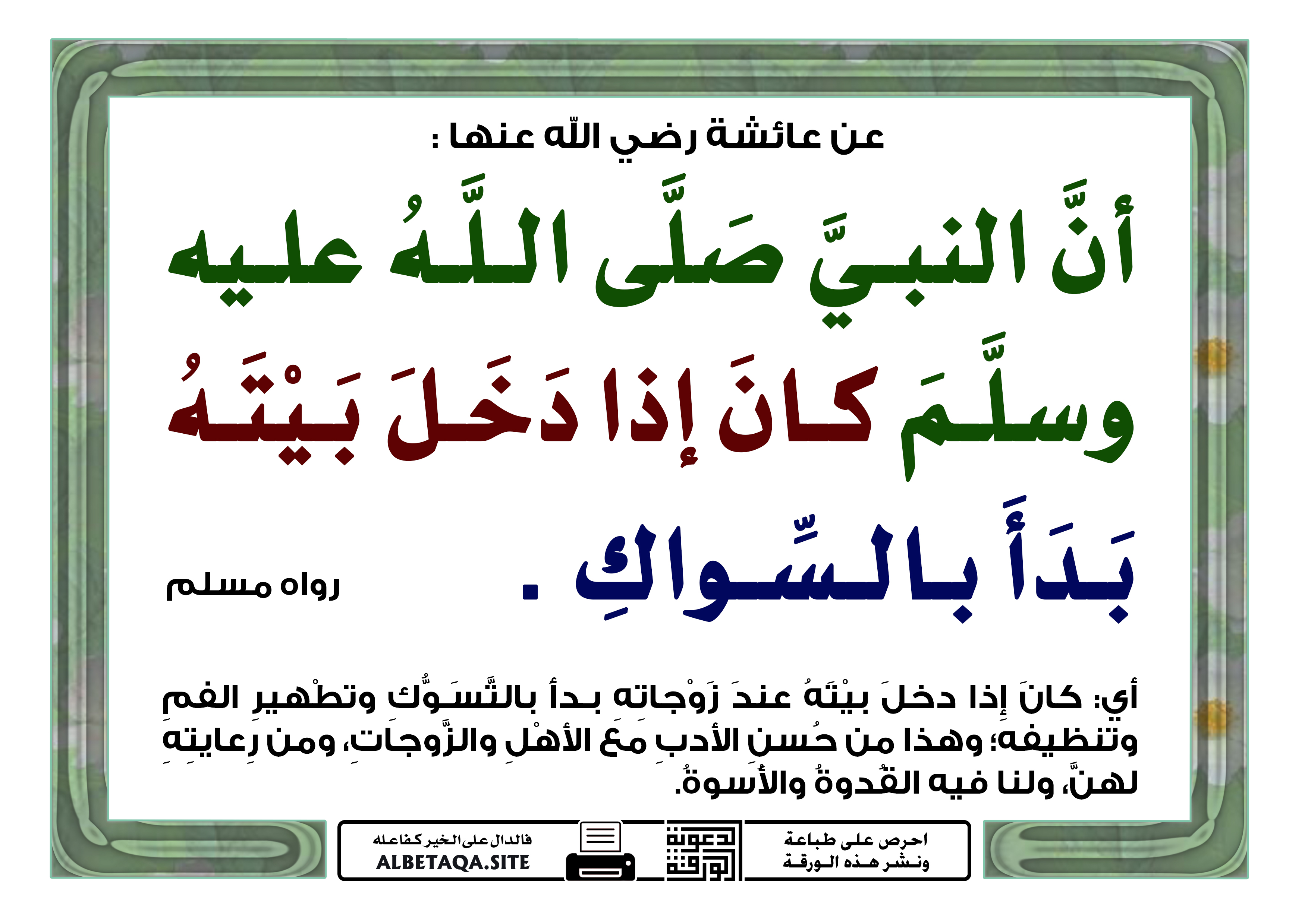 (أن النبي صلى الله عليه وسلم كان إذا دخل بيته بدأ بالسواك). رواه مسلم