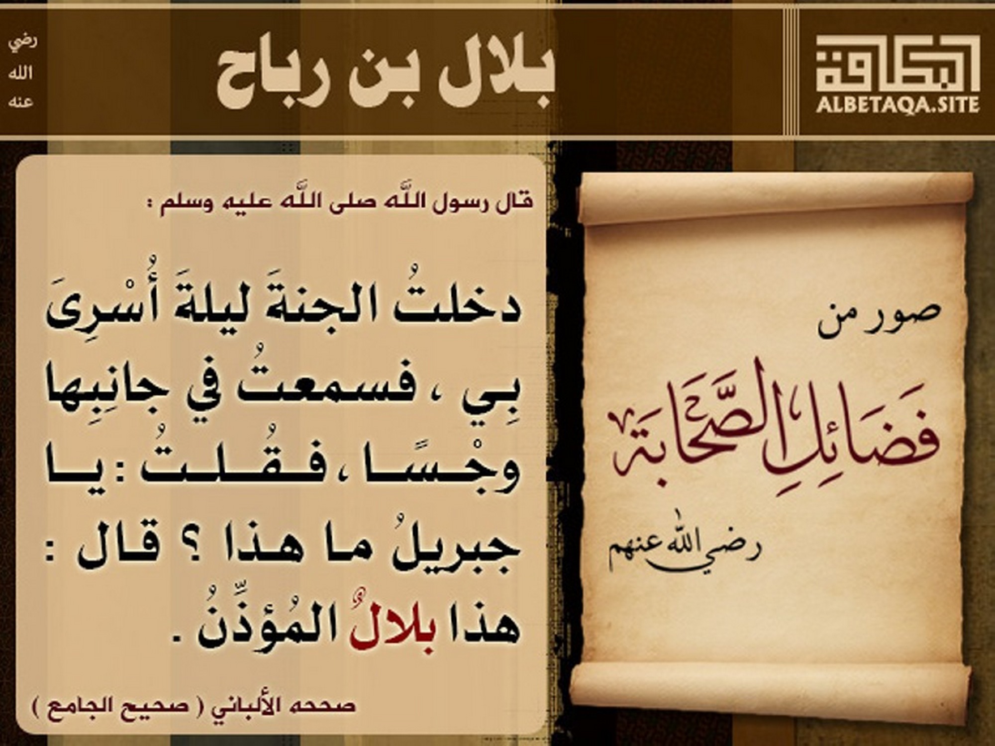 (دخلت الجنة ليلة أسرى بي، فسمعت في جانبها وجسا، فقلت: يا جبريل ما هذا؟ قال: هذا بلال المؤذن). صححه الألباني (صحيح الجامع)