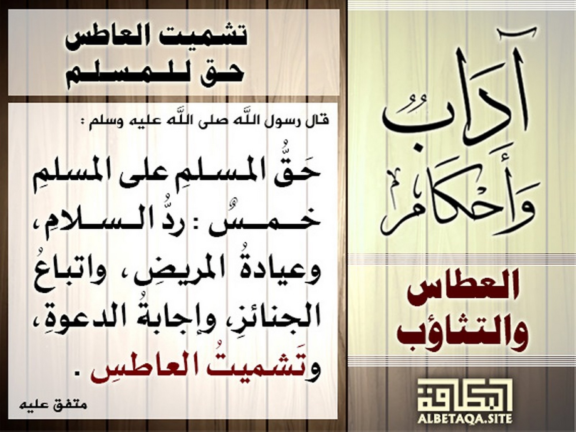 ((حق المسلم على المسلم خمس: رد السلام، وعيادة المريض، واتباع الجنائز، وإجابة الدعوة، وتشميت العاطس.)) متفق عليه