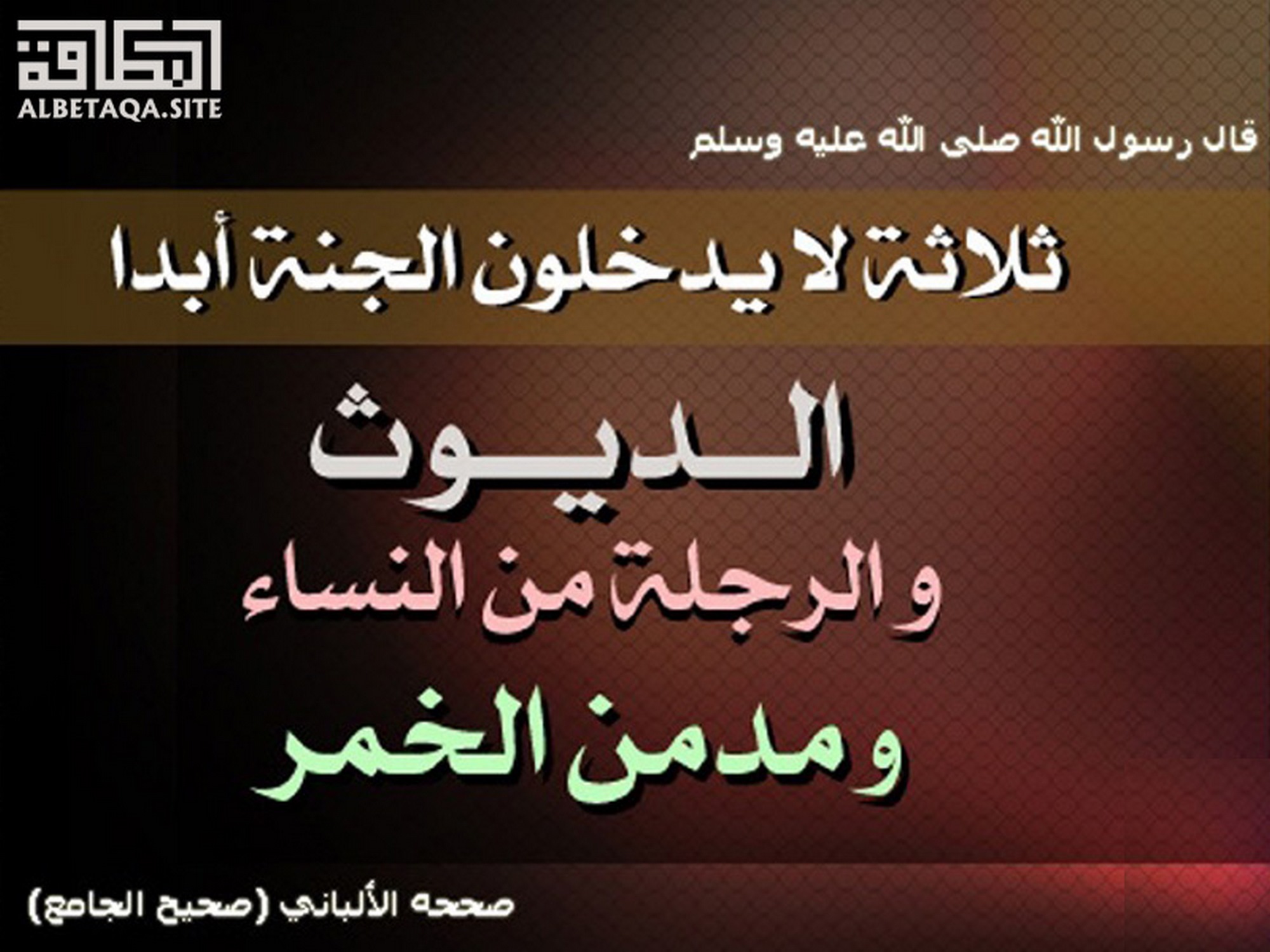 (ثلاثة لا يدخلون الجنة الديوث والرجلة من النساء ومدمن الخمر). صححه الألباني صحيح الجامع