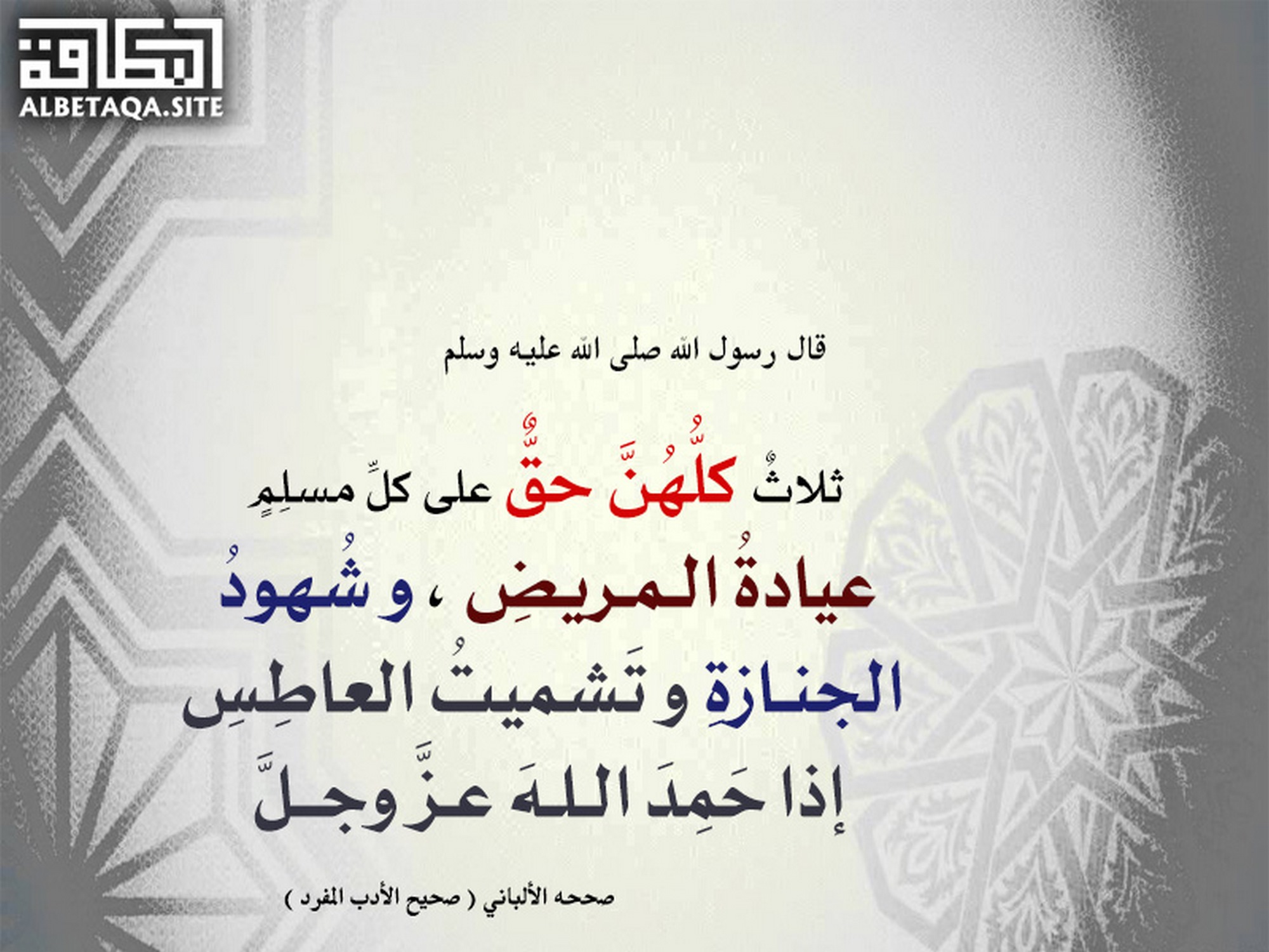 (ثلاث كلهن حق على كل مسلم: عيادة المريض، وشهود الجنازة، وتشميت العاطس إذا حمد الله عز وجل). صححه الألباني (صحيح الأدب المفرد)