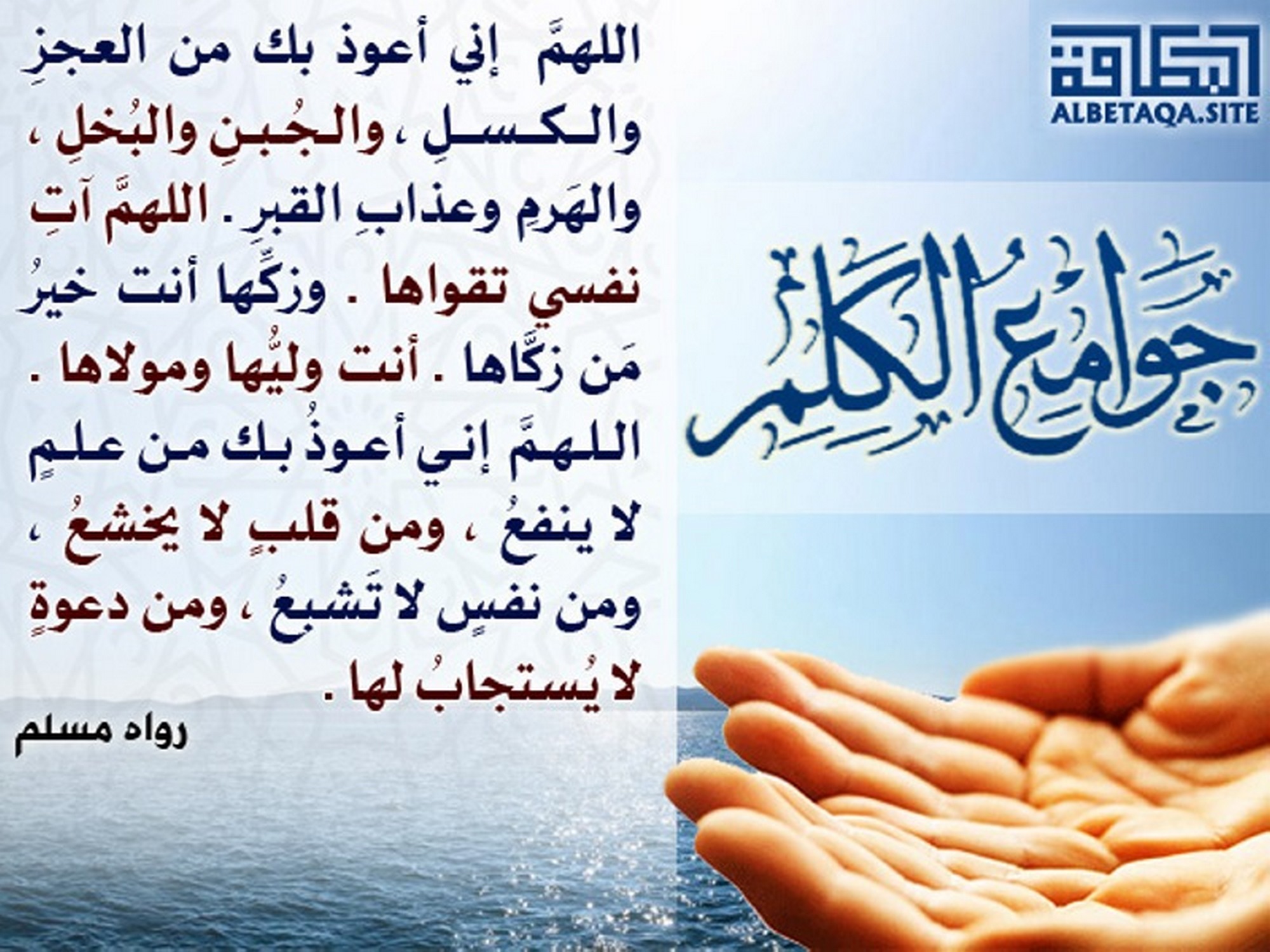 (اللهم إني أعوذ بك من العجز والكسل، والجبن والبخل، والهرم وعذاب القبر. اللهم آت نفسي تقواها. وزكها أنت خير من زكاها. أنت وليها ومولاها. اللهم إني أعوذ بك من علم لا ينفع، ومن قلب لا يخشع، ومن نفس لا تشبع، ومن دعوة لا يستجاب لها). رواه مسلم