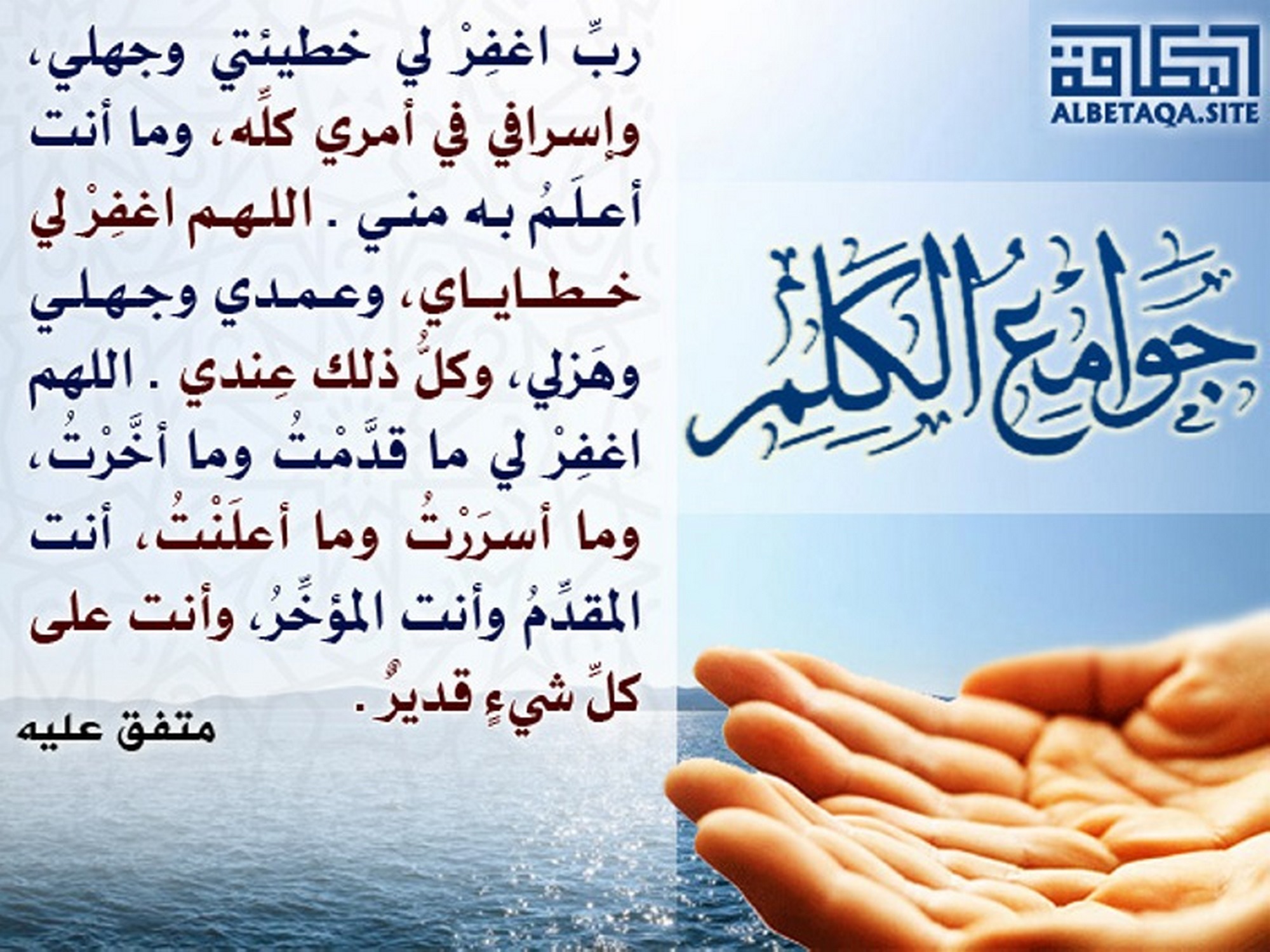 (رب اغفر لي خطيئتي وجهلي، وإسرافي في أمري كله، وما أنت أعلم به مني. اللهم اغفر لي خطاياي، وعمدي وجهلي وهزلي، وكل ذلك عندي. اللهم اغفر لي ما قدمت وما أخرت، وما أسررت وما أعلنت، أنت المقدم وأنت المؤخر، وأنت على كل شيء قدير). متفق عليه