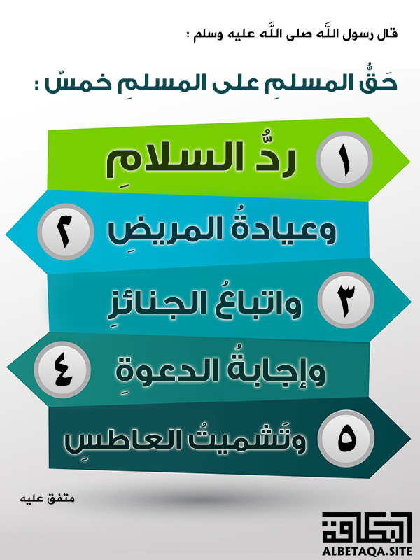 (حق المسلم على المسلم خمس: رد السلام، وعيادة المريض، واتباع الجنائز، وإجابة الدعوة، وتشميت العاطس). متفق عليه
