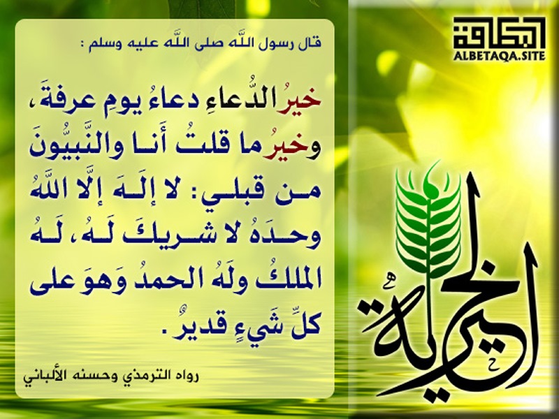 (خير الدعاء دعاء يوم عرفة، وخير ما قلت أنا والنبيون من قبلي: لا إله إلا الله وحده لا شريك له، له الملك وله الحمد وهو على كل شيء قدير). رواه الترمذي وحسنه الألباني