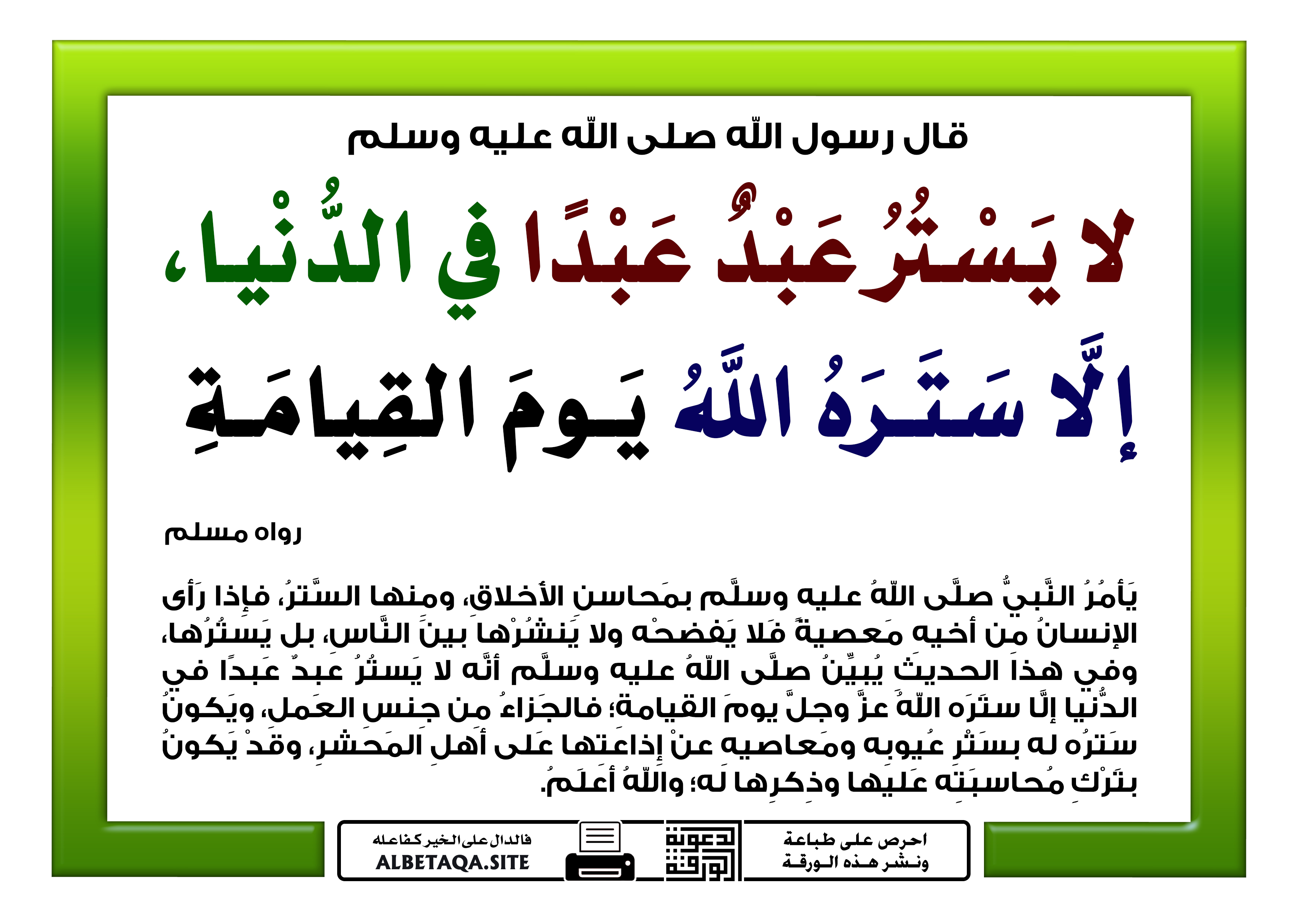 (لا يستر عبد عبدا في الدنيا، إلا ستره الله يوم القيامة). رواه مسلم