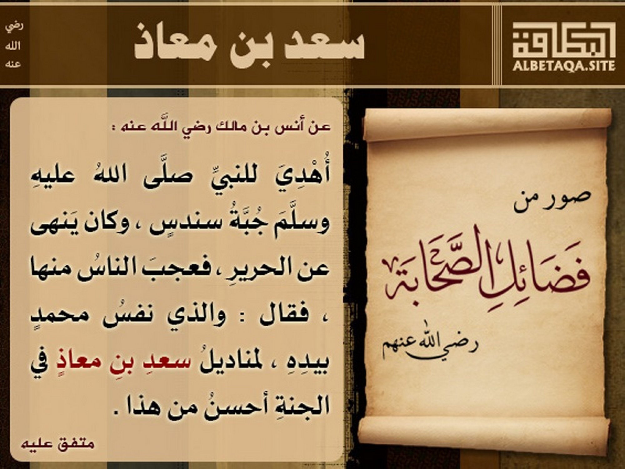 (أهدي للنبي صلى الله عليه وسلم جبة سندس، وكان ينهى عن الحرير، فعجب الناس منها، فقال: والذي نفس محمد بيده، لمناديل سعد بن معاذ في الجنة أحسن من هذا). متفق عليه