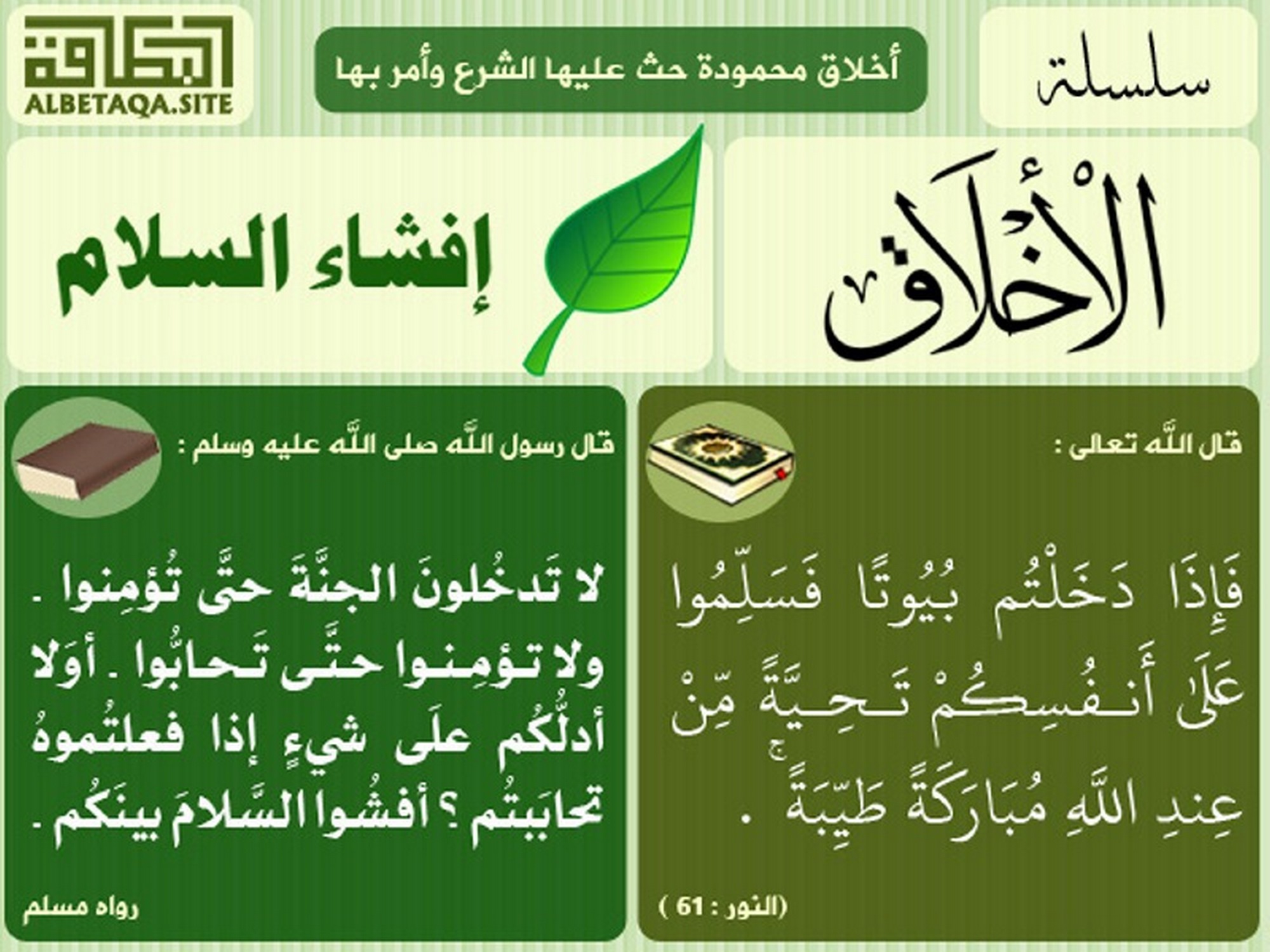 (لا تدخلون الجنة حتى تؤمنوا. ولا تؤمنوا حتى تحابوا. أولا أدلكم على شيء إذا فعلتموه تحاببتم أفشوا السلام بينكم). رواه مسلم