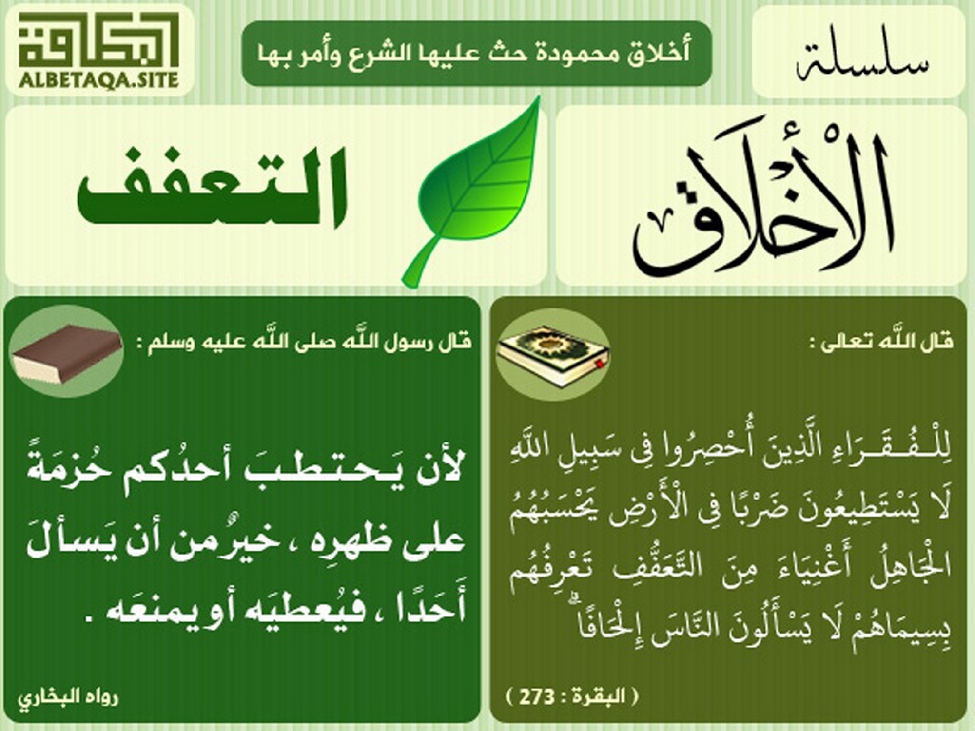 (للفقراء الذين أحصروا في سبيل الله لا يستطيعون ضربا في الأرض يحسبهم الجاهل أغنياء من التعفف تعرفهم بسيماهم لا يسألون الناس إلحافا). (البقرة : 273)