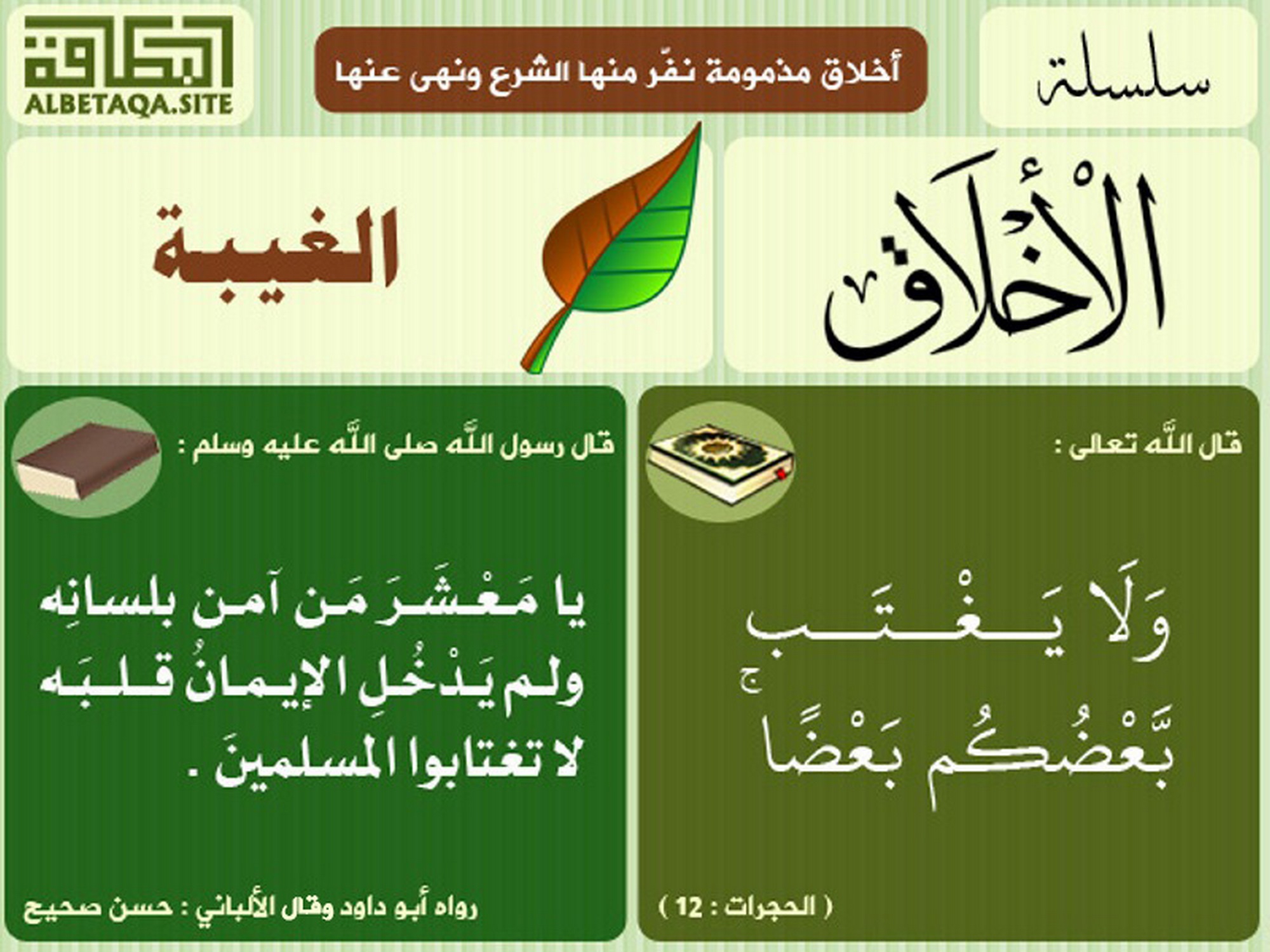 (يا معشر من آمن بلسانه ولم يدخل الإيمان قلبه، لا تغتابوا المسلمين). رواه أبو داود وقال الألباني: حسن صحيح