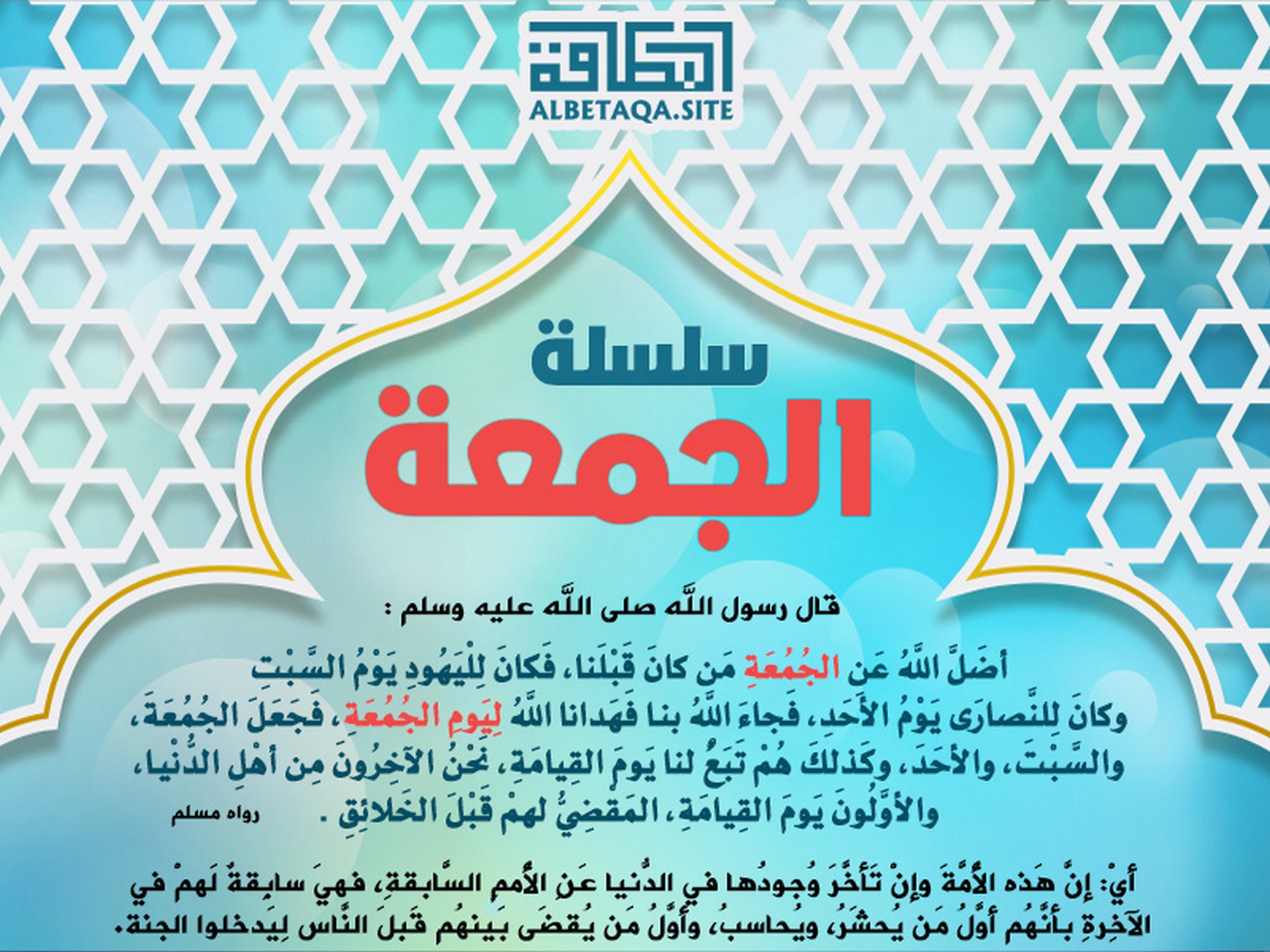 (أضل الله عن الجمعة من كان قبلنا، فكان لليهود يوم السبت، وكان للنصارى يوم الأحد، فجاء الله بنا فهدانا الله ليوم الجمعة، فجعل الجمعة، والسبت، والأحد، وكذلك هم تبع لنا يوم القيامة، نحن الآخرون من أهل الدنيا، والأولون يوم القيامة، المقضي لهم قبل الخلائق). رواه مسلم