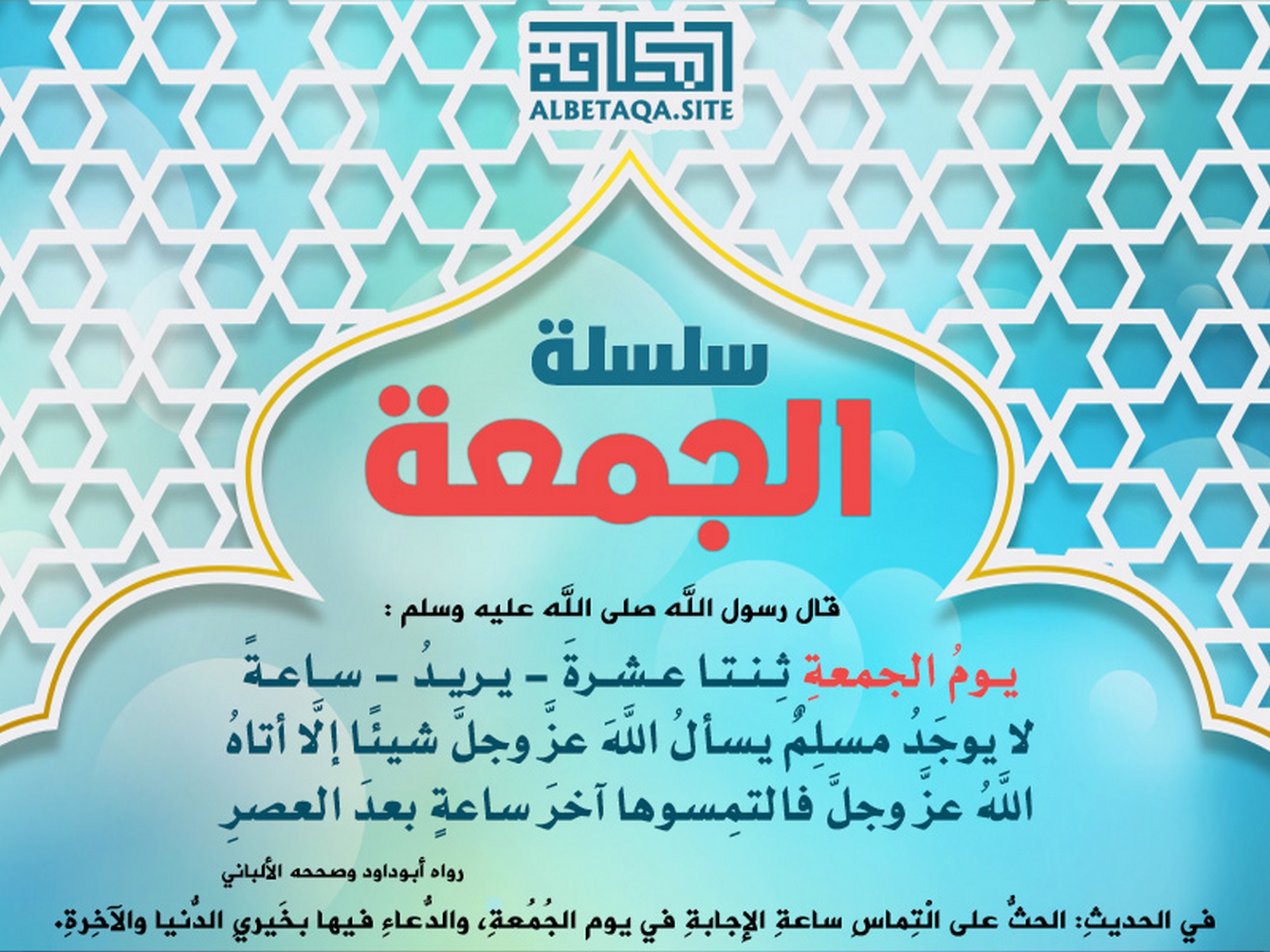 (يوم الجمعة ثنتا عشرة – يريد – ساعة لا يوجد مسلم يسأل الله عز وجل شيئا إلا أتاه الله عز وجل فالتمسوها آخر ساعة بعد العصر). رواه أبوداود وصححه الألباني